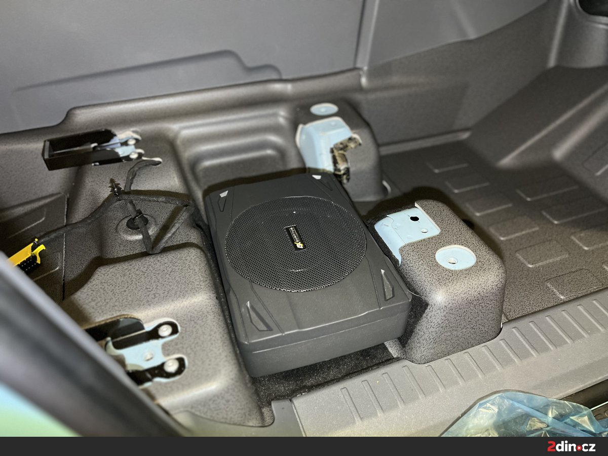 Pro doplnění nízkofrekvenční složky jsme zvolili aktivní subwoofer ESX Q201A, jenž nabízí skvělou kvalitu v kompaktním provedení. Tento model vyniká rychlou odezvou a přesným basem, který nepřebíjí ostatní pásma. Díky svým rozměrům nijak nenarušuje celkový design interiéru ani užitkové vlastnosti vozu. V tomto případě jsme subwoofer nainstalovali tak, aby byl diskrétní, a přitom účinný z hlediska zvukového projevu – výrazně nám s tím pomohla odhlučněná podlaha a kufr. Výsledkem je pevný a energický bas, který dodává hudbě ty správné grády.