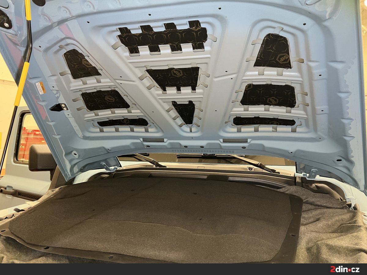 Podlaha je u aut jedním z hlavních přenašečů vibrací a nízkofrekvenčního hluku, který proniká z prostoru pod vozem a podvozkových částí. V rámci jejího odhlučnění jsme uplatnili naši osvědčenou vícevrstvou metodu. Nejprve jsme aplikovali antivibrační materiály STP Black Gold Camo a STP Black Silver, které se postaraly o zpevnění plechů a eliminaci primárních vibrací. Následně jsme využili termoakustický materiál STP AeroFlex 3, který pohlcuje nízkofrekvenční hluk a zároveň izoluje interiér proti extrémním teplotám, což je v terénním voze s často neizolovanou podlahou klíčové. Výsledkem je výrazné snížení hluku šířeného od kol, motorového prostoru a podvozku.