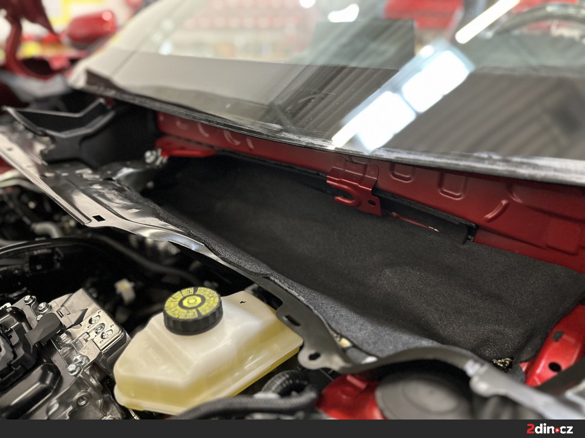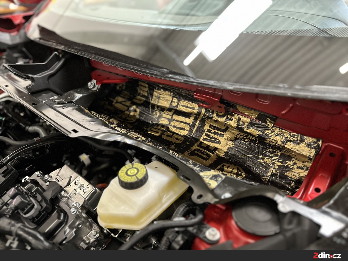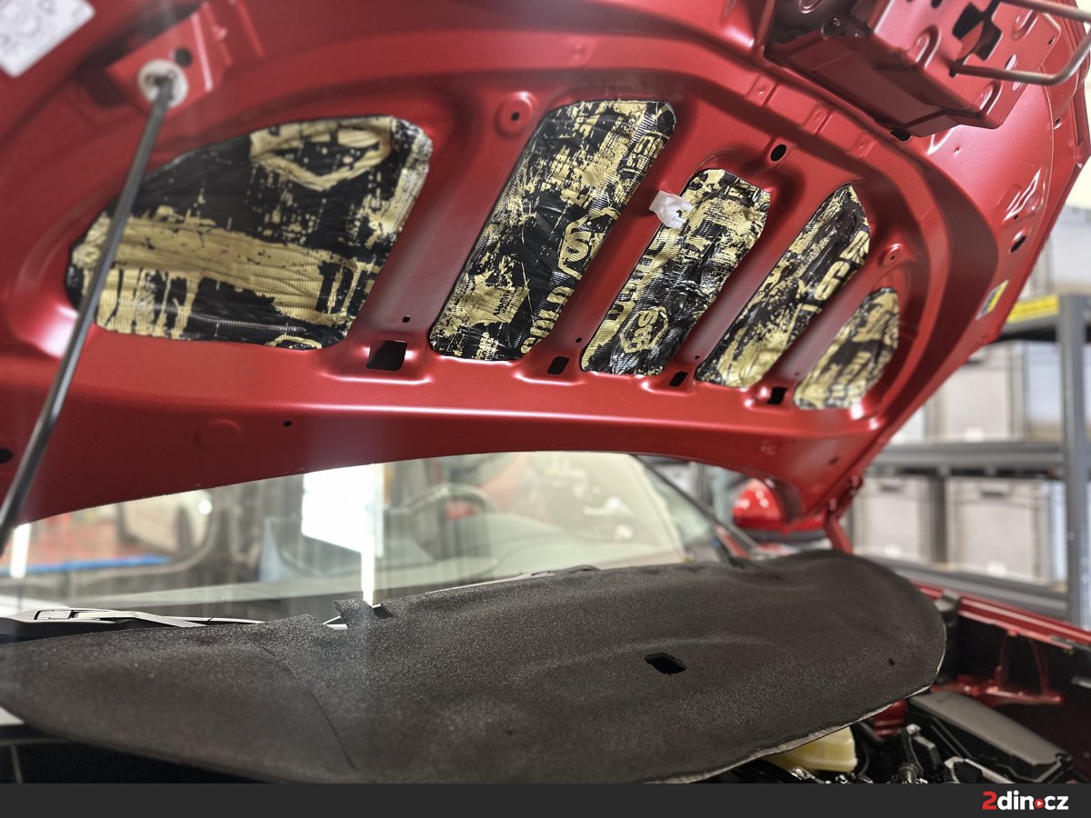 Opomenout jsme nemohli ani prostor motoru, konkrétně kapotu a mezimotorovou přepážku. Právě přes tyto části konstrukce se mohou do interiéru dostávat mechanické zvuky od burácejícího agregátu, vibrace i vyšší frekvence, které jsou při jízdě nepříjemné zejména při akceleraci. Plochy byly opatřeny antivibračními materiály STP Aggressive Silver a STP Devil’s Gold, které pomáhají zpevnit konstrukci a potlačit vibrace. Dále byly použity vhodné izolační vrstvy, které přispívají k omezení průniku hluku směrem k posádce. Odhlučnění v prostoru motoru se projevuje především při rozjezdech, prudší akceleraci a při jízdě do stoupání, kdy motor pracuje ve vyšší zátěži. Kabina díky tomu působí klidněji, méně rušivě a celkový akustický projev vozu je vyrovnanější i při náročnějším provozu.
