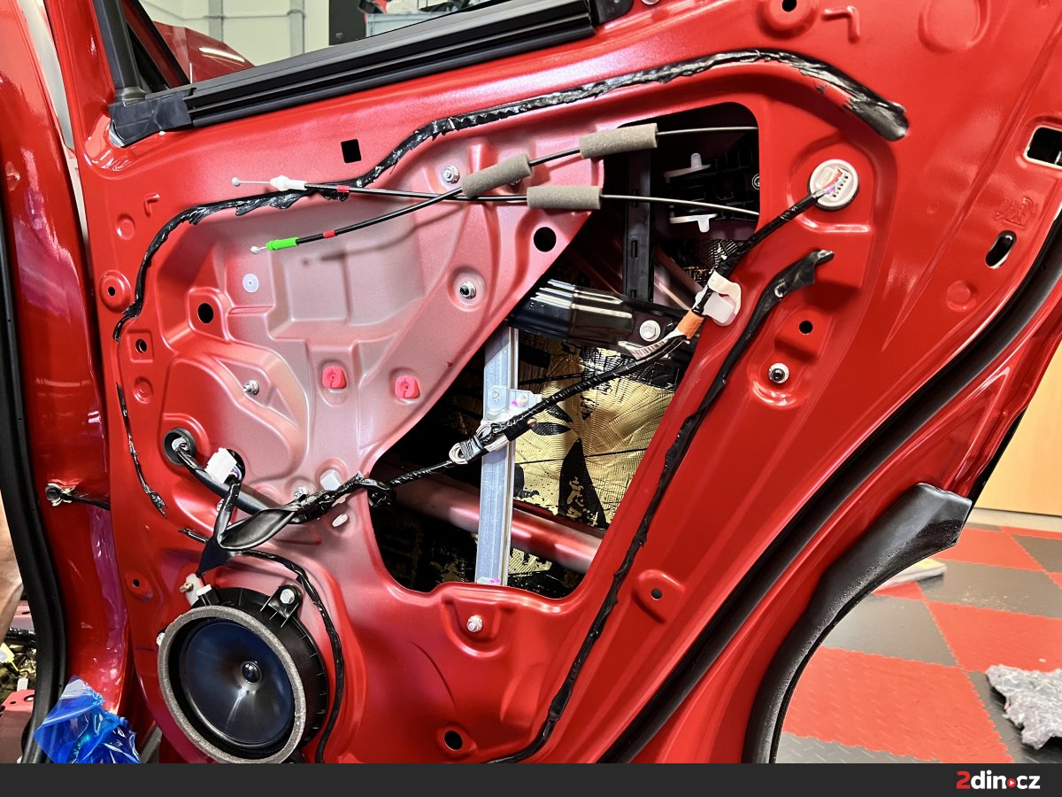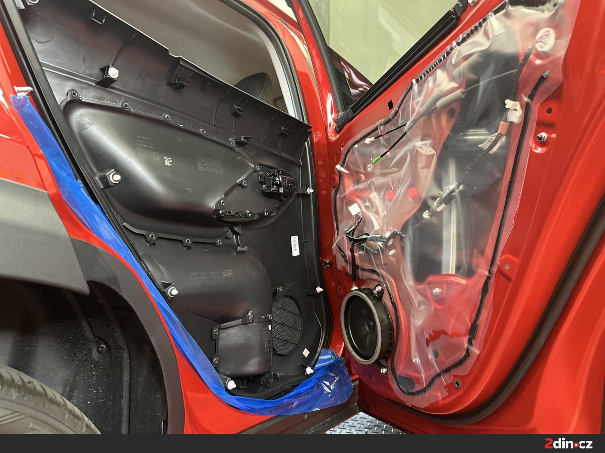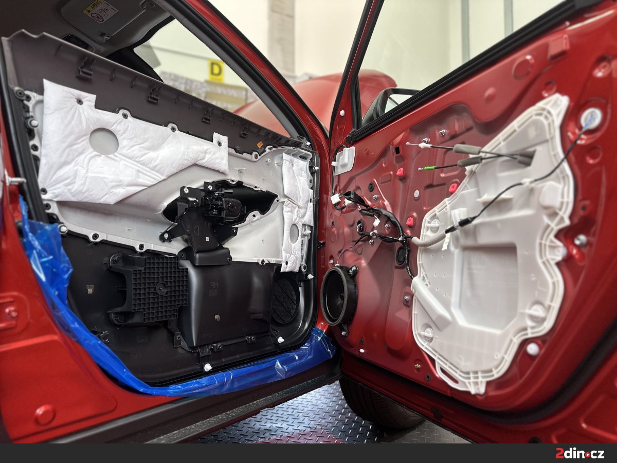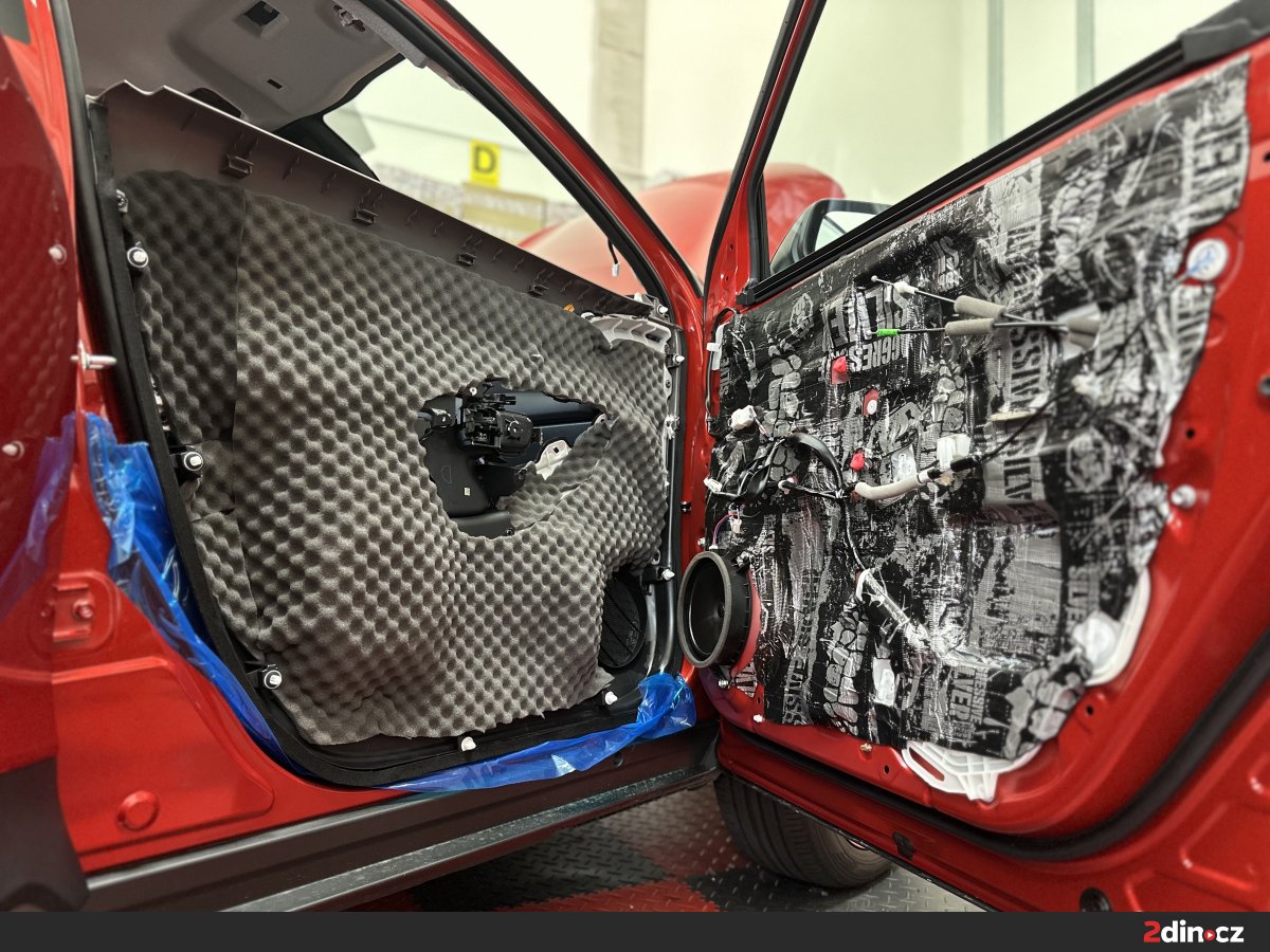 Dveře jsou jednou z klíčových částí karoserie, přes které se do interiéru přenáší hluk z okolního provozu, proudění vzduchu i drobné vibrace plechových ploch. Na vnější i vnitřní část plechu jsme zde aplikovali antivibrační materiály STP Aggressive Silver a STP Devil’s Gold, které pomáhají eliminovat vibrace plechu při jízdě. Následně byl použit akustický materiál STP Biplast 10, jenž pohlcuje část zvukových vln uvnitř konstrukce dveří a přispívá k lepšímu vytlumení negativních vlivů z exteriéru. Takovéto ošetření dveří znamená nejen nižší hlučnost v kabině, ale také "prémiovější" zavírání dveří a celkově hodnotnější pocit z vozu. Odhlučnění auta v této oblasti má navíc pozitivní vliv i na poslech hudby, protože reproduktory pracují ve stabilnějším a akusticky příznivějším prostředí.