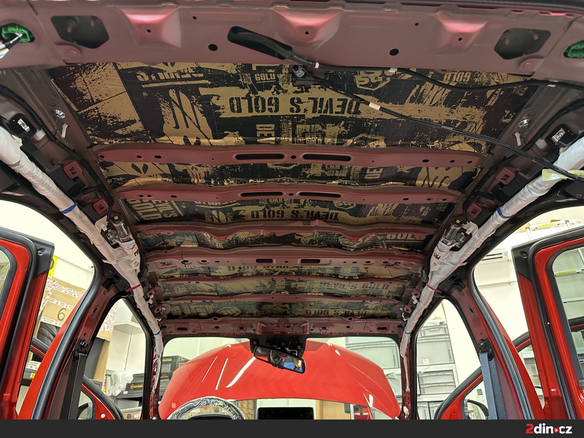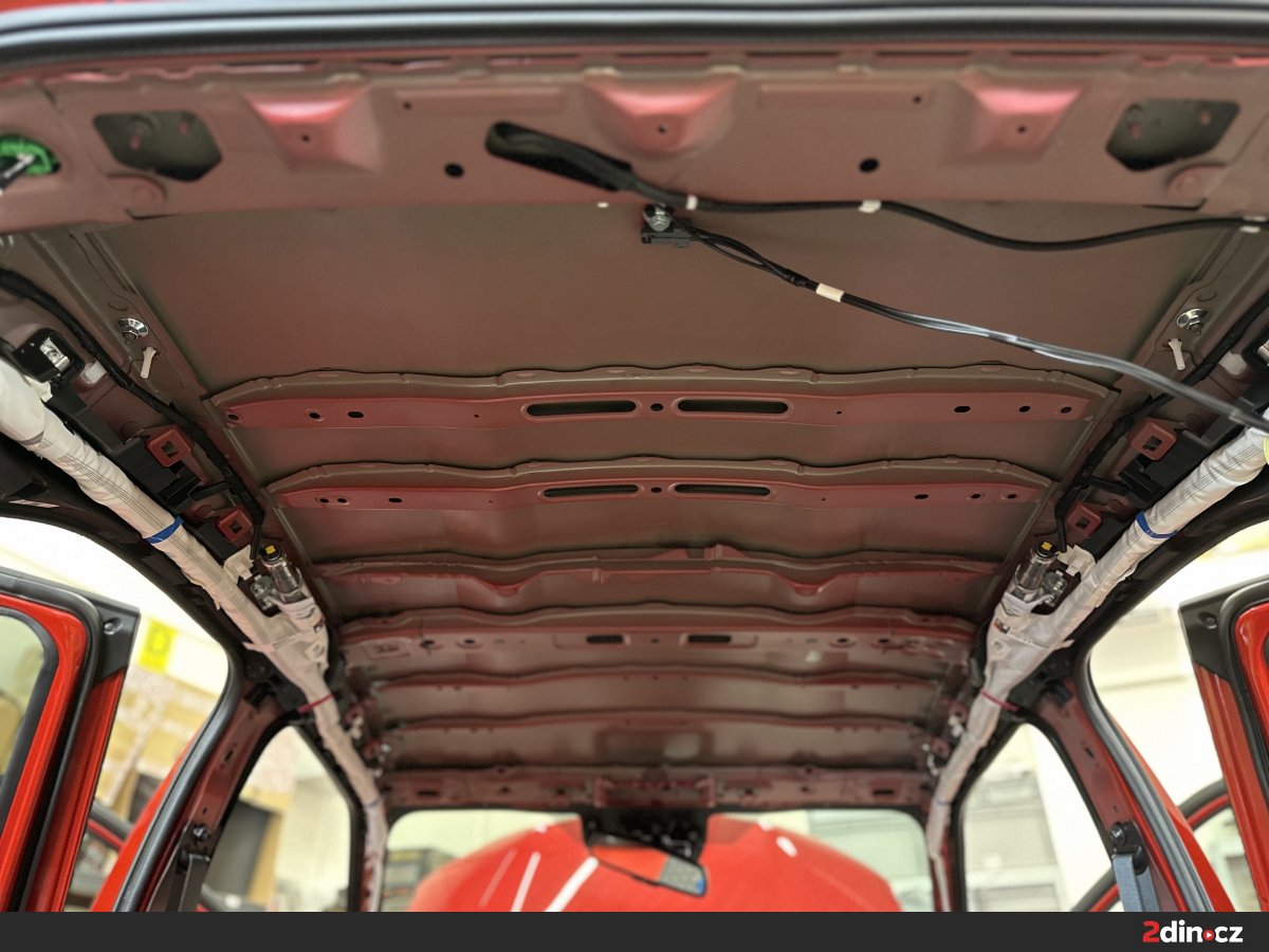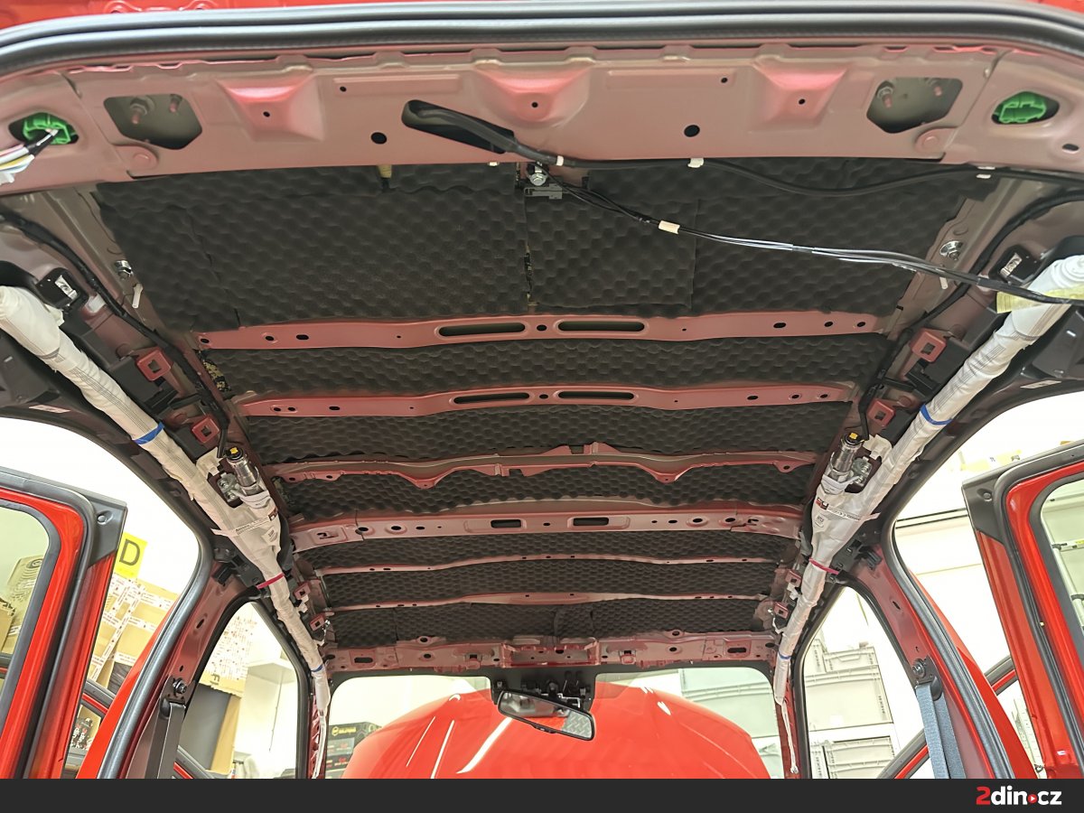 Střechu se v rámci odhlučnění často podceňuje, byť má zásadní vliv na to, jak posádka vnímá hluk zvenčí. V rámci kompletního odhlučnění vozu balíčkem Premium Plus jsme proto odstrojenou střechu opatřili antivibračním materiálem STP Aggressive Silver, který zpevňuje plech a omezuje jeho vibrace. Následně byl použit akustický materiál STP Biplast 10, jenž pomáhá pohlcovat část hluku a přispívá k celkovému ztišení interiéru. Tato kombinace výrazně zlepšuje akustickou pohodu při vyšších rychlostech, kdy bývá proudění vzduchu kolem karoserie výraznější. Tlumení vozidla v oblasti střechy se pozitivně projeví také při nepříznivém počasí, protože interiér nepůsobí tak „plechově“ a bubnování od deště není tolik slyšet. Kabina tak získává kultivovanější a klidnější charakter.
