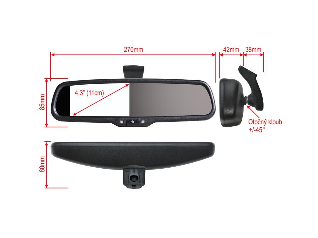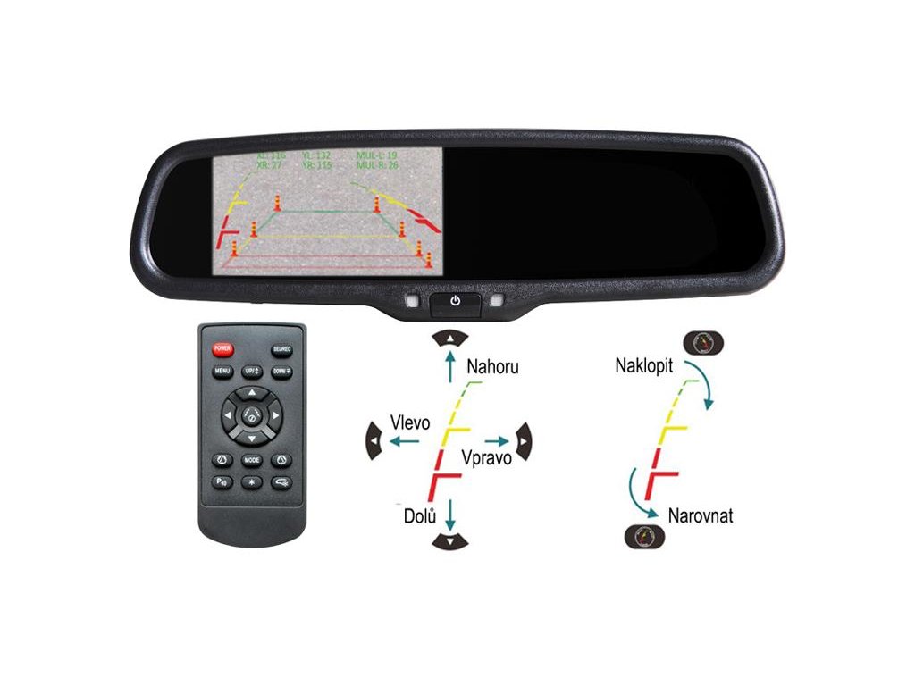 Monitor umístěný ve zpětném zrcátku slouží pro zobrazení obrazu z parkovací kamery nebo pro zobrazení obrazu DVD přehrávače. Zrcátko je umístěno na čelním skle na místě originálního zrcátka. Snadná instalace bez zásahu do interiéru automobilu.