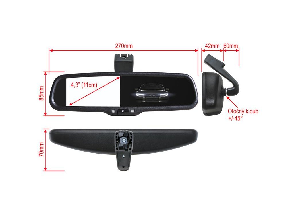 Monitor umístěný ve zpětném zrcátku slouží pro zobrazení obrazu z parkovací kamery nebo pro zobrazení obrazu DVD přehrávače. Zrcátko je umístěno na čelním skle na místě originálního zrcátka. Snadná instalace bez zásahu do interiéru automobilu.