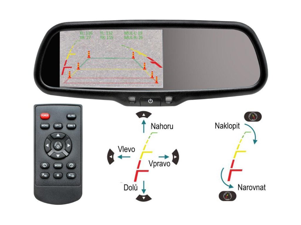 Pomocí dálkového ovladače je možné nastavit vodicí linky (trajektorie) zobrazených na monitoru při použití zadní parkovací kamery. Linky je možné posunovat ve vodorovném i svislém směru nebo je naklopit tak aby odpovídali umístění kamery a prostoru za vozidlem. Při použití kamery s vodícími linkami, je možné tuto funkci vypnout.
