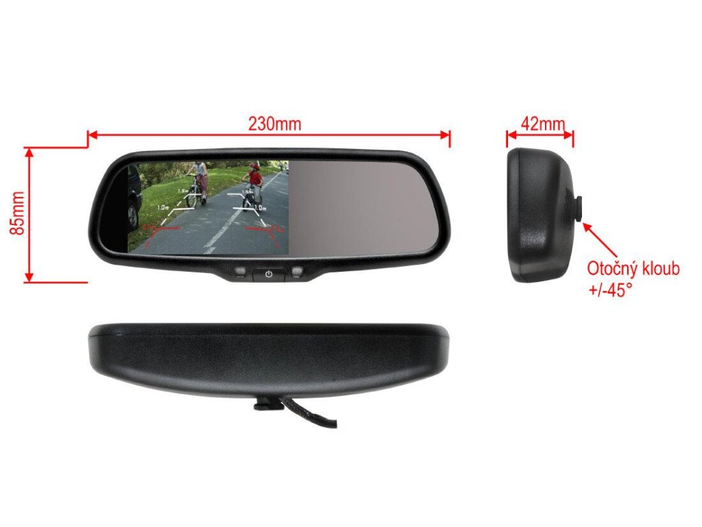 Monitor umístěný ve zpětném zrcátku slouží pro zobrazení obrazu z parkovací kamery nebo pro zobrazení obrazu DVD přehrávače. Zrcátko je umístěno na čelním skle na místě originálního zrcátka. Snadná instalace bez zásahu do interiéru automobilu.