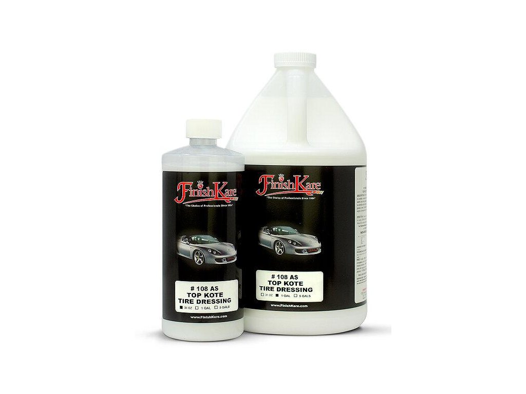 Finish Kare #108 Top Kote Tire Dressing 916 ml. Tekutý sealant speciálně vyvinutý na polymerové bázi, určený pro ochranu gumy, plastů a kožených povrchů auta. S lehkostí obnovuje a ochraňuje kůži, interiérové i exteriérové plastové části a gumové i vinylové povrchy. Top Kote Tire Dressing nezanechává mastný ani mokrý povrch ale dokonale matný. Díky obsahu antistatických složek, nedovoluje usazování prachu, pylu a dalších drobných nečistot. Ideální je na použití v kožených interiérech a také motorovém prostoru, venkovních i vnitřních plastových dílech na gumovém těsnění a výjimkou nejsou ani pneumatiky.
