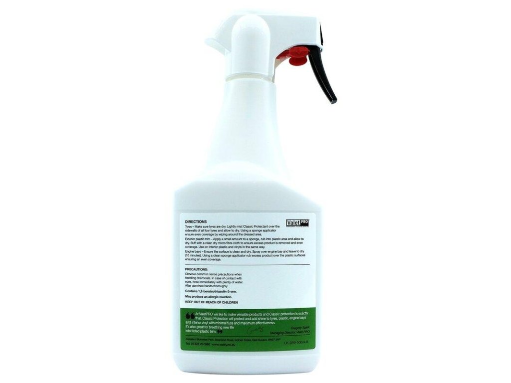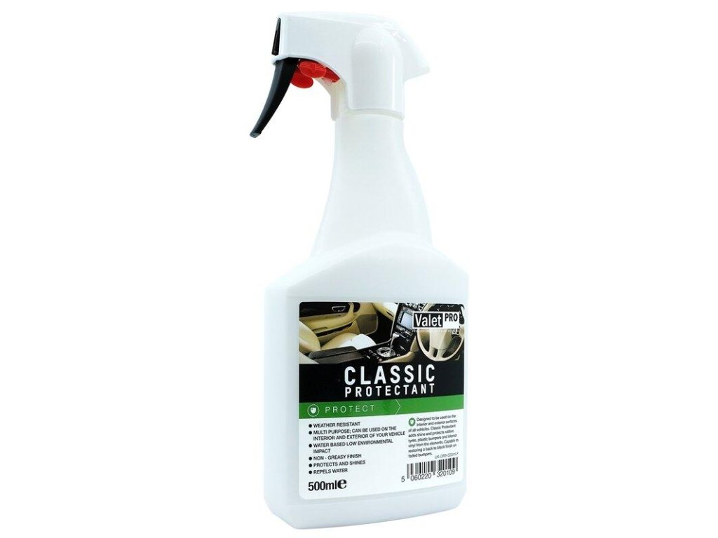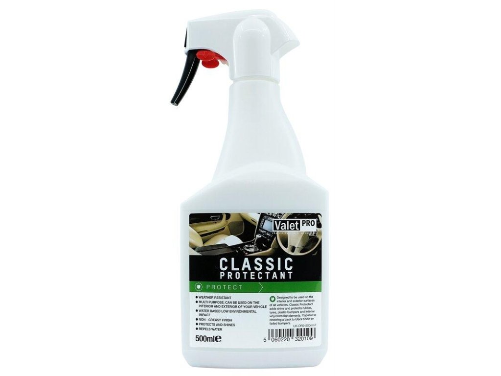 Kvalitní silikonová emulze ValetPro Classic Protectant je odolná vůči povětrnostním vlivům. Směs je tvořená kombinací silikonů pro dodání vysokého lesku a odolnosti. Po nanesení přípravek chrání a dodává lesk pneumatikám, exteriérovým plastům, interiérovým plastům i kůži. Použití je velmi snadné. Lze s ním oživit vybledlé plasty. Používá se v neředěné podobě, ale lze jej naředit v poměru 1:1.