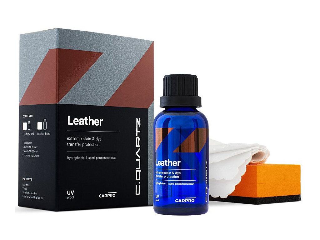 CarPro CQuartz Leather & Vinyl je ochranný povlak pro kůži a vinyl. Povrch chrání před znečištěním, zároveň předchází vzniku skvrn nebo obarvení. Aplikace CarPro CQuartz Leather & Vinyl je velmi snadná. Díky nové technologii využívající ty nejlepší dostupné ingredience nabízí dokonalý výsledek a životnost 12-24 měsíců.