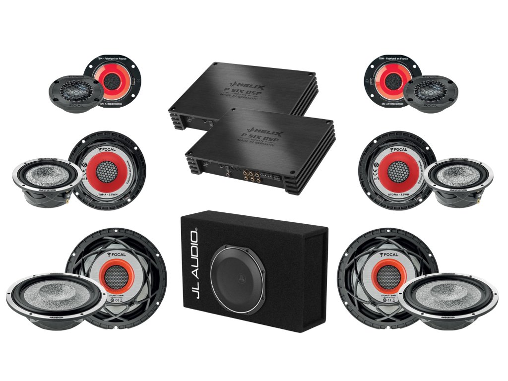 Sestavu high-endových reproduktorů a subwooferů (včetně aktivního subwooferu v kufru od amerického výrobce JL Audio) napojíme na jeden nebo dvojici špičkových zesilovačů prémiové německé značky Helix, která spadá do portfolia Audiotec Fischer, kde cílí na vyšší segment trhu.