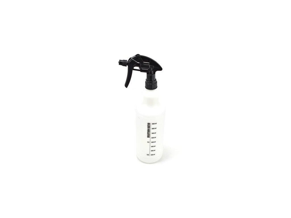 Skvělý pomocník při ředění a míchání mycích nebo leštících prostředků. Nastavíte množství, které chcete, aby rozprašovač dávkoval a máte tak jistotu stejnoměrně nanesených přípravků. Pokud špičku rozprašovače úplně zašroubujete, zamezíte tak stříkání. Rozptyl střiku jednoduše nastavíte otáčením špičky. Nádoba je vyrobena z plastu, který je rezistentní, vůči kyselým i alkalickým tekutinám. Nádoba je označena ryskami i pomůckami, pro případné míchání přípravků.