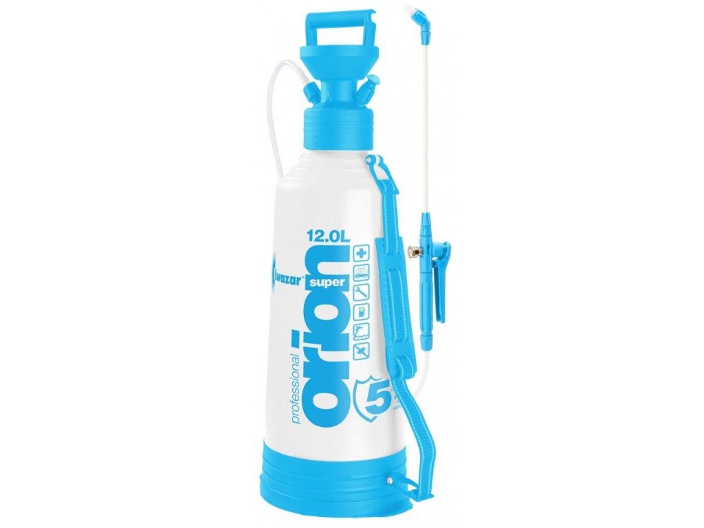 Kwazar Orion Super Pro+ V-12 ruční tlakový postřikovač 12000 ml: ruční tlakový postřikovač se zvýšenou chemickou odolností vůči kyselým a alkalickým látkám s nádrží pro 12 L roztoku. Inovativní postřikovač s těsněním Viton, které je výjimečné svou chemickou odolností a ochraňuje nádobu před přetlakováním. Má širokou škálu kapacit od 3 do 12 let a vy si tak můžete vybrat zařízení podle vašich potřeb. Je ideální na práci na středních a velkých plochách. Stabilizační základna ochraňuje zásobník před mechanickým poškozením. Nádrž nedisponuje technologickými otvory, což prodlužuje její životnost i bezpečnost práce. Hlavice v praktickém tvaru a průhledný proužek na zásobníku pro přesné dávkování přípravků. Spirálová tryska je vyrobena z mechanicky i chemicky odolného dílu ze skleněných vláken.