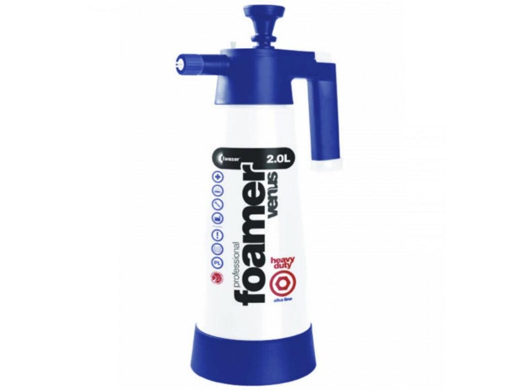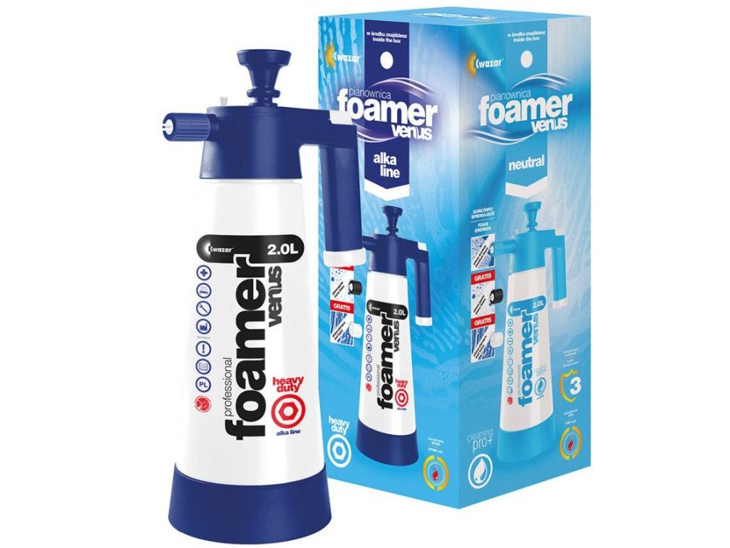 Kwazar VENUS Super Foamer V-2 ALKALINE + Extra foaming endings ruční tlakový pěnovač odolný vůči alkalickým látkám 2000 ml. Tlakový pěnovač určený k ručnímu použití je výjimečný svojí rezistentností vůči alkalickým látkám a chemickou odolností disponuje nádržkou o velikosti 2 litů roztoku. Napěnovač Venus Foamel je skvělým pomocníkem při práci se silně koncentrovanými přípravky určené například k předmývání auta. Jeho provedení je maximálně odolné k alkalickým přípravkům a dalším chemicky silnějším přípravkům. V profesionálních detailerských studiích se používá především na předmytí karoserie, čištění disků kol nebo celých motorů. Využít jej můžete také v domácnosti nebo na zahradě k práci s chemicky náročnějšími přípravky, které je potřeba napěnit. Jeho víceúčelovost podtrhuje i to, že je možné jej využít k bodovému čištění fasád domů.