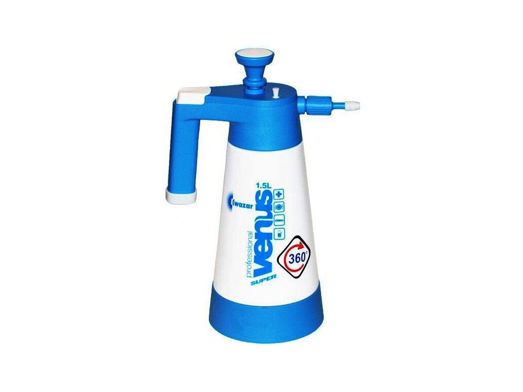 Kwazar VENUS Super Pro+ 360 V-1.5 ruční talkový postřikovač. Mixovací láhev o obsahu 1500 ml, chemicky odolný, ruční postřikovač a systém 360 stupňů. Mercury Super Pro+ Je šikovný pomocník k práci na malých nebo středně velkých plochách jako je přesně automobilový průmysl. Postřikovač 360°využívá elektrickou silikonovou sací trubici se zátěží a filtr pro potlačení kapalin a díky tomu je postřikovač funkční v každé poloze a dokáže pracovat i s minimálním množstvím roztoku v nádržce. Díky vysoké chemické odolnosti se hodí k použití v detailingových salonech, autoservisech nebo k domácím pracím.