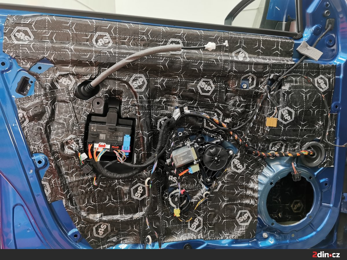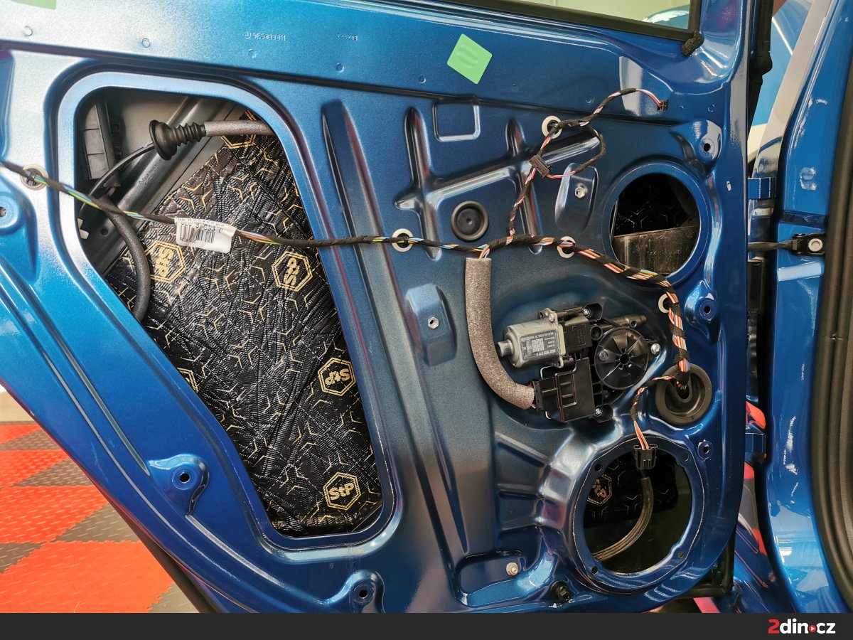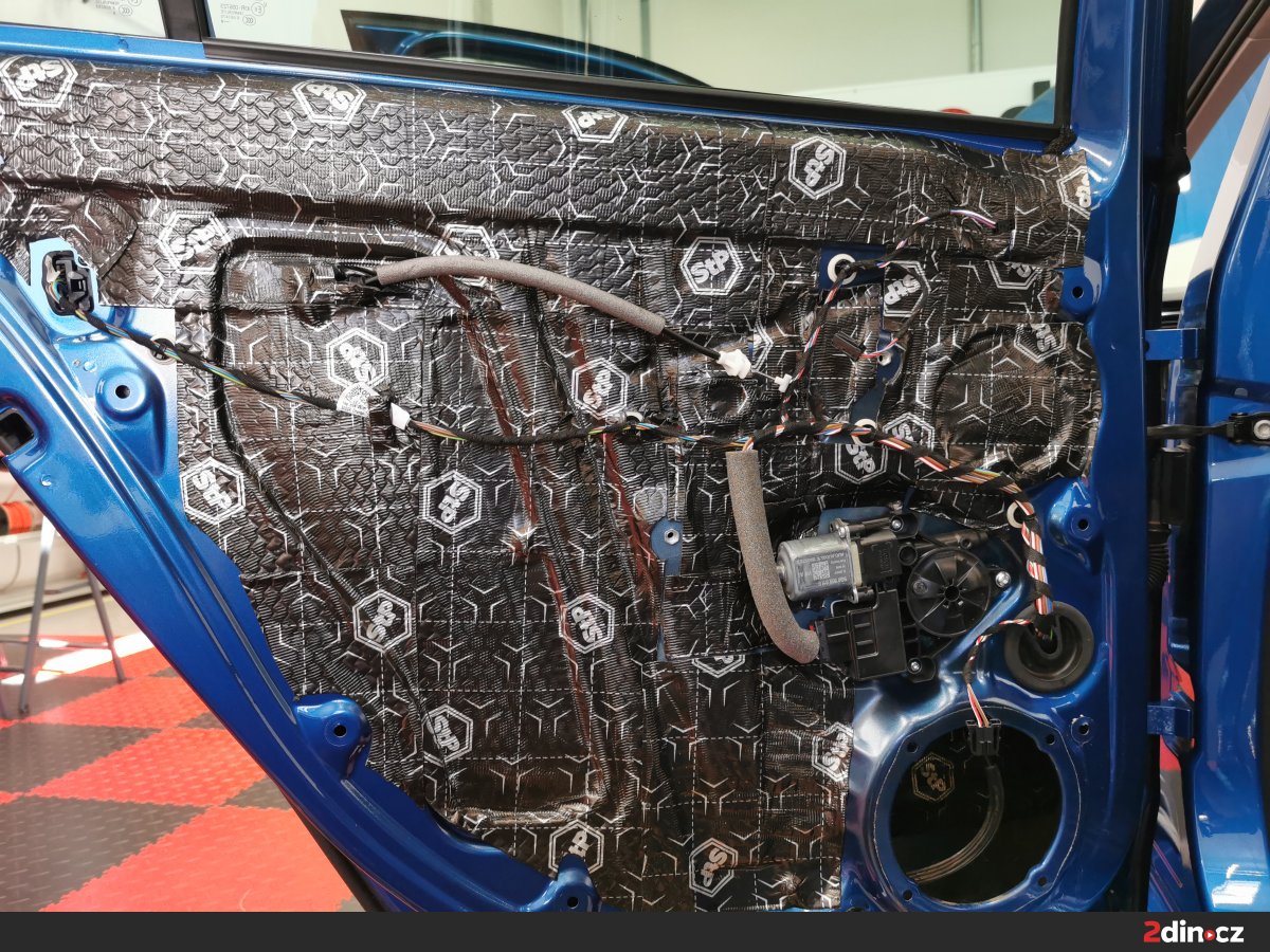 Za účelem maximálního využití potenciálu nových reproduktorů jsme provedli základní dvouvrstvé odhlučnění dveří. Nejprve jsme aplikovali antivibrační materiály STP Black Gold Camo a STP Black Silver, které účinně tlumí vibrace karoserie a eliminují rezonance. Druhou vrstvu tvoří akustická pěna STP Biplast 10, která zlepšuje akustické vlastnosti dveřních prostor. Výsledkem je nejen lepší zvuková izolace interiéru, ale především znatelně přesnější a čistší projev reproduktorů.
