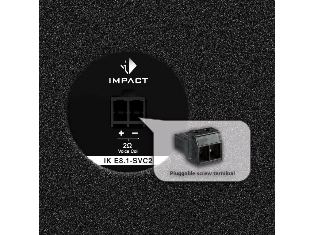 Sofistikovaný a kompaktní design portované skříně IK E8.1-SVC2 poskytuje působivý akustický tlak a hluboké basy, a to i v těch nejtěsnějších prostorách. Tento subwoofer, vybavený 8” (200 mm) subwooferem s ručně nabíraným papírovým kuželem, zajišťuje bohatý a silný nízkofrekvenční výkon v celém vozidle.