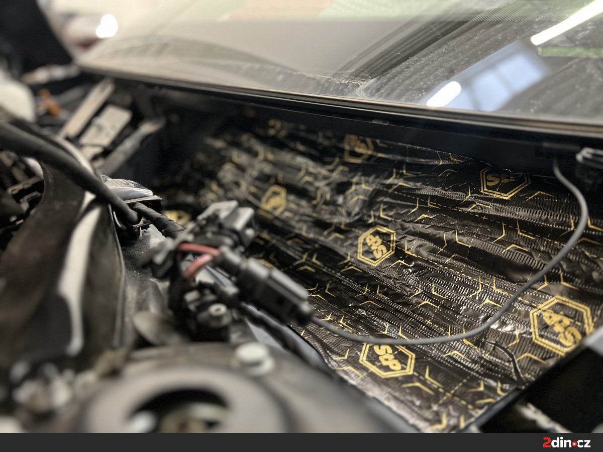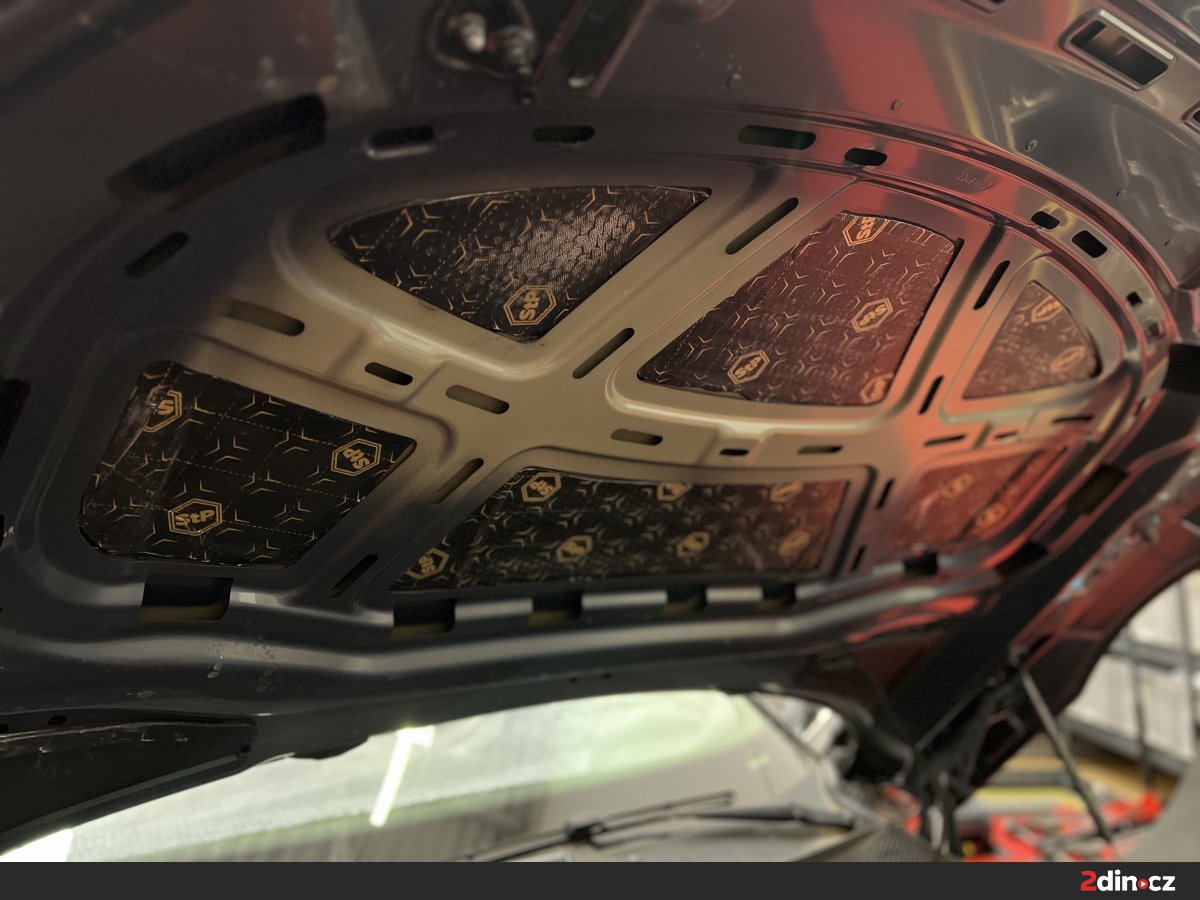 V rámci této zakázky jsme odhlučňovali také prostor motoru, kam spadá kapota a mezimotorová přepážka. Prostor mezi motorem a kabinou totiž patří mezi hlavní cesty, kudy do interiéru proniká mechanický hluk společně s vibracemi od pohonné jednotky. Na kapotu i mezimotorový prostor jsme aplikovali kombinaci antivibračního materiálu STP Black Gold a tepelně a akusticky izolačního materiálu STP AeroFlex 10, který má vynikající schopnost tlumit hluk a zároveň izolovat teplo. Výsledkem je znatelné snížení motorového hluku přenášeného do kabiny a současně klidnější chod vozu v nízkých i vyšších otáčkách.
