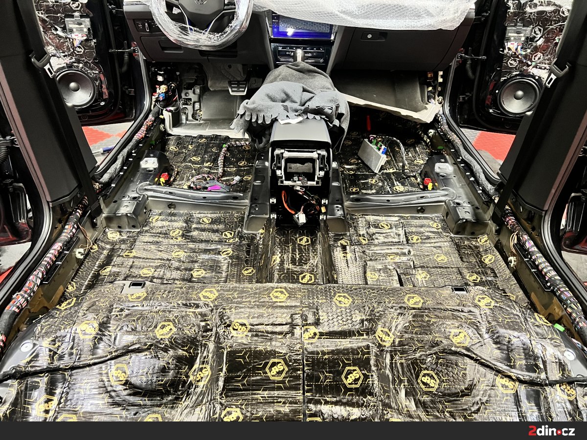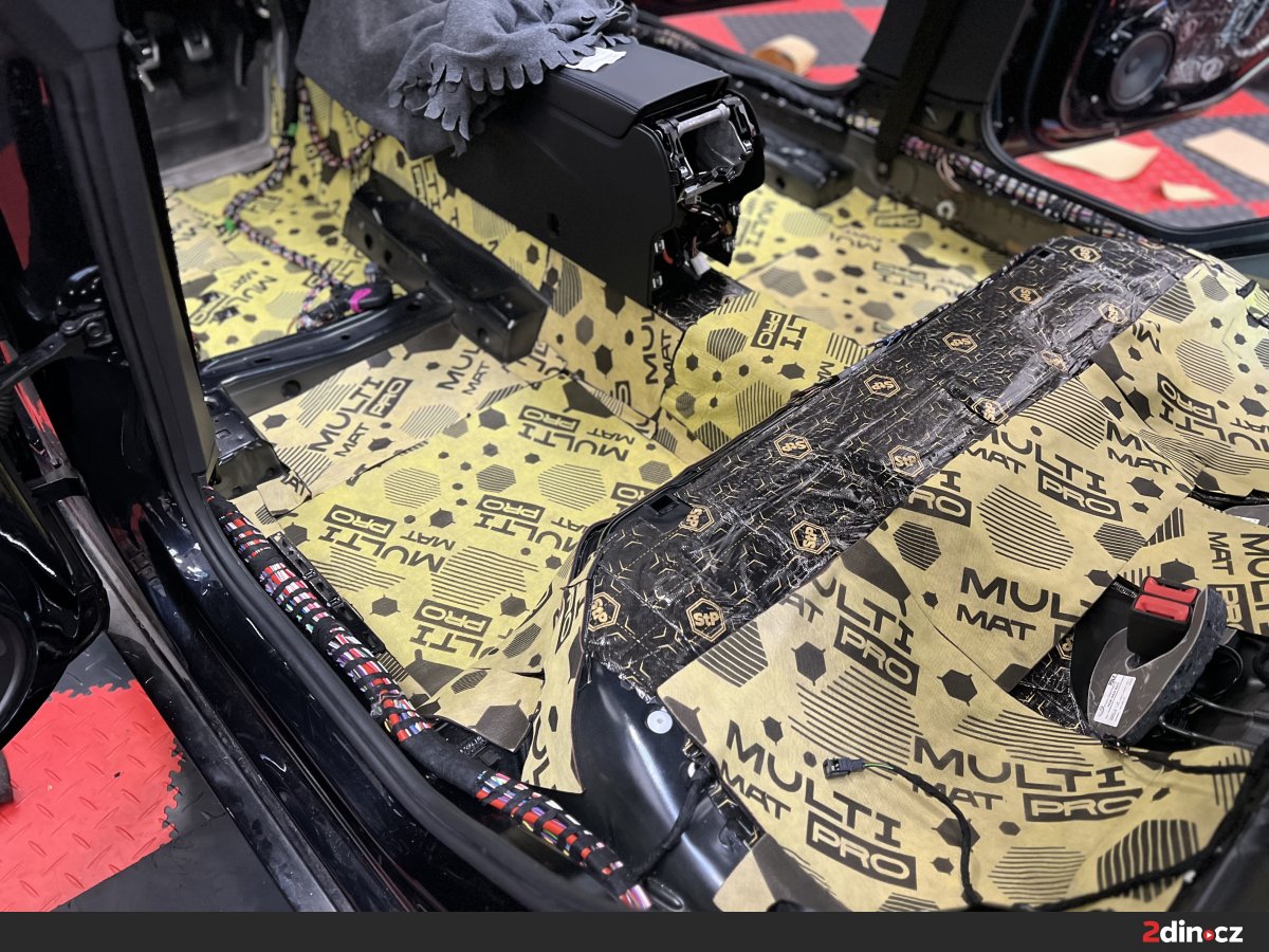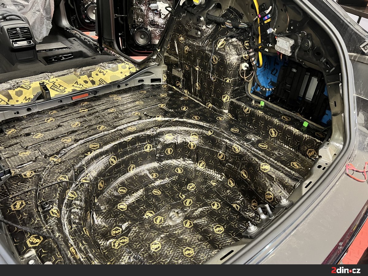 Opomenout jsme samozřejmě nemohli ani podlahu, která je jednou z nejrozsáhlejších ploch ve voze. Ošetřili jsme ji pomocí dvou vrstev materiálu. První tvoří STP Black Gold, který eliminuje vibrace a celkově zpevňuje konstrukci plechu. Následovala aplikace termoakustického materiálu STP AeroFlex 3, který snižuje míru přenosu hluku od vozovky a současně působí jako tepelný štít. Vzhledem k rozsahu této části vozu je efekt odhlučnění skutečně výrazný – nejen že došlo k výraznému ztlumení hlubokých, dunivých frekvencí od vozovky, ale zlepšilo se i jízdní pohodlí posádky při jízdě na nerovném povrchu.