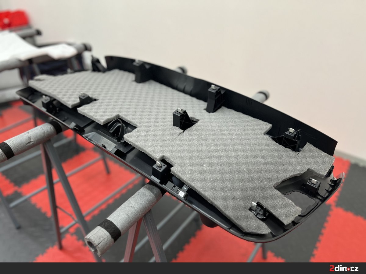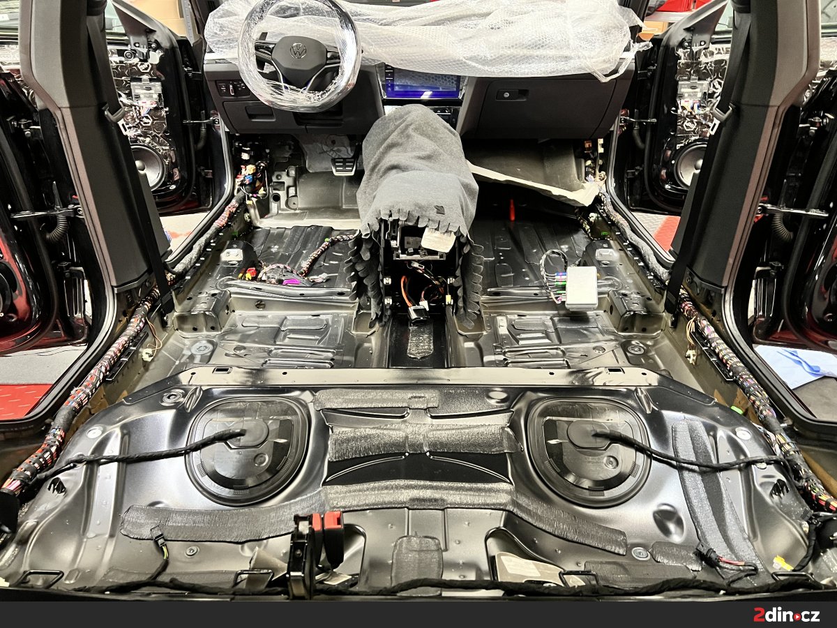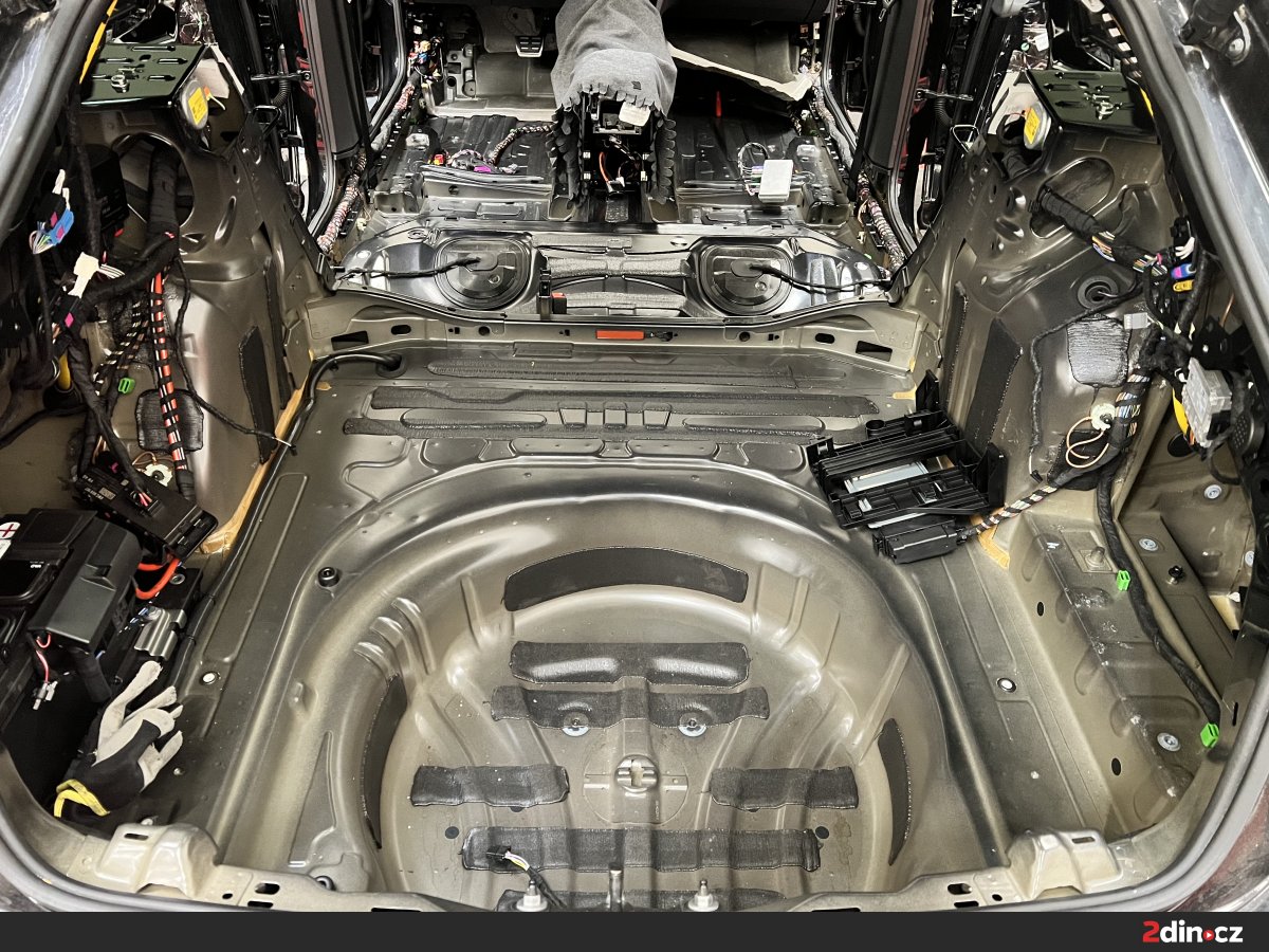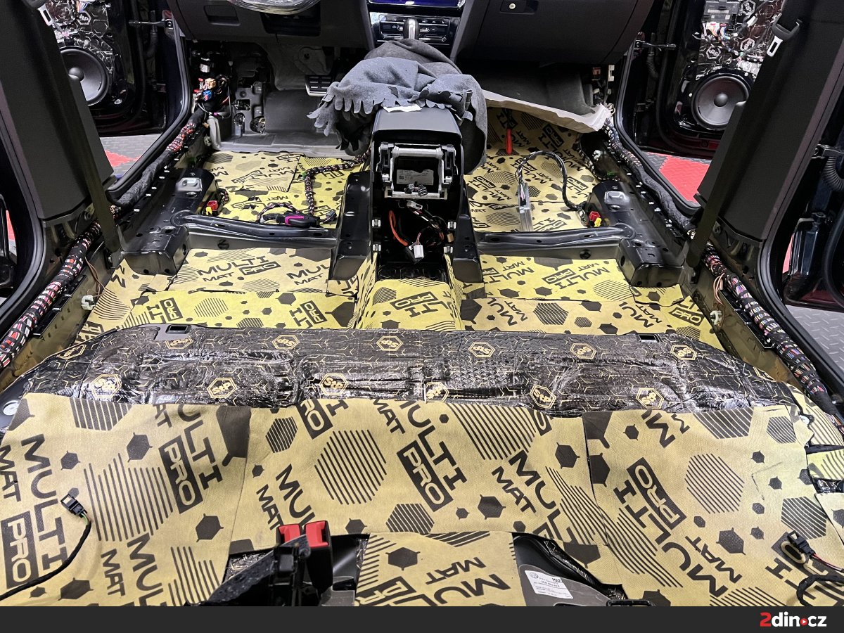 Opomenout jsme samozřejmě nemohli ani podlahu, která je jednou z nejrozsáhlejších ploch ve voze. Ošetřili jsme ji pomocí dvou vrstev materiálu. První tvoří STP Black Gold, který eliminuje vibrace a celkově zpevňuje konstrukci plechu. Následovala aplikace termoakustického materiálu STP AeroFlex 3, který snižuje míru přenosu hluku od vozovky a současně působí jako tepelný štít. Vzhledem k rozsahu této části vozu je efekt odhlučnění skutečně výrazný – nejen že došlo k výraznému ztlumení hlubokých, dunivých frekvencí od vozovky, ale zlepšilo se i jízdní pohodlí posádky při jízdě na nerovném povrchu.