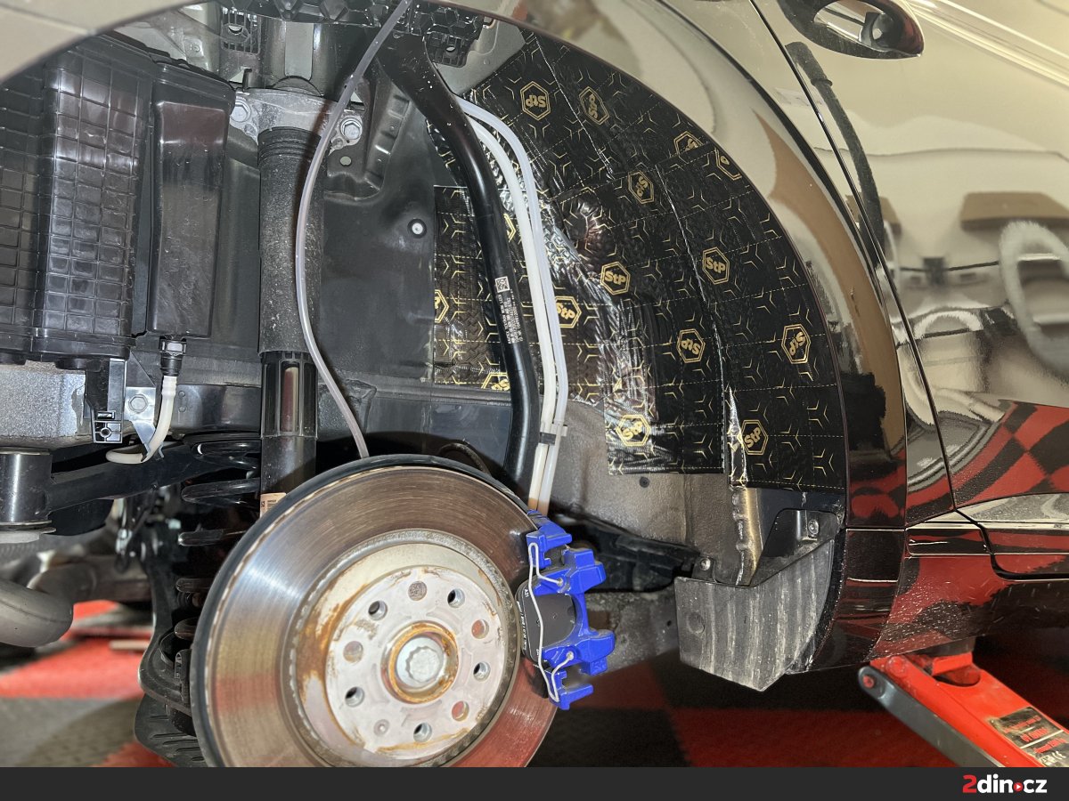 Také podběhy, přední i ty zadní, představují exponovanou část vozu, kudy se dovnitř ve značné míře dostává valivý hluk od kol a vozovky. Na kovové části jsme zde aplikovali opět antivibrační materiál STP Black Gold, který za účelem dosažení maximálního akustického útlumu doplnil CTK Multimat PRO. Na vnitřní části podběhů, které jsou vystaveny vlhkosti a různým abrazivním vlivům, jsme použili akustickou pěnu STP AeroFlex 3, jež nenasává vodu, vzhledem k čemuž pro tato místa představuje ideální volbu. Ošetření podběhů ve výsledku citelně snížilo míru hluku, který do interiéru skrz tato místa běžně proniká.