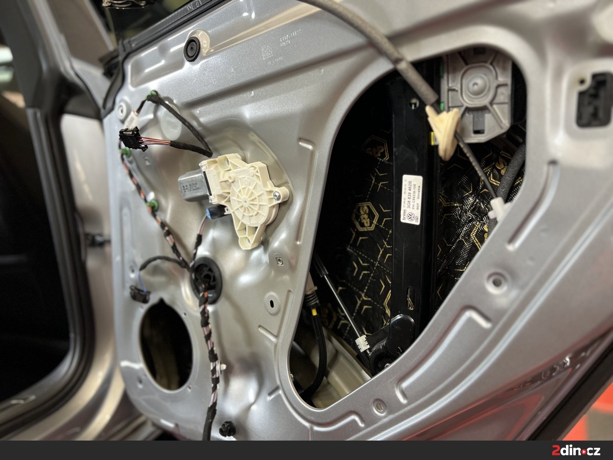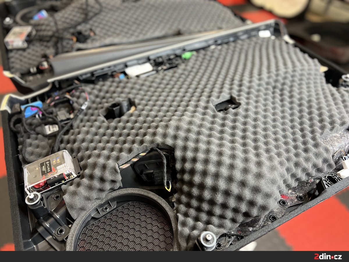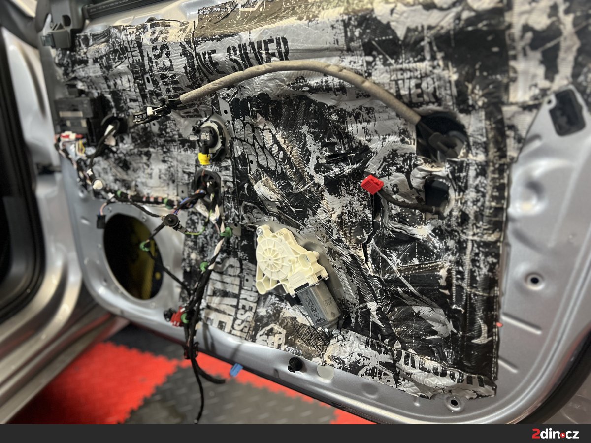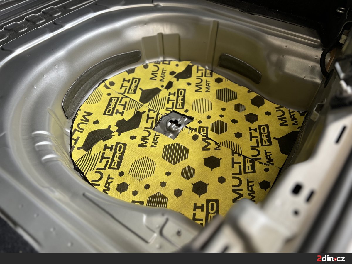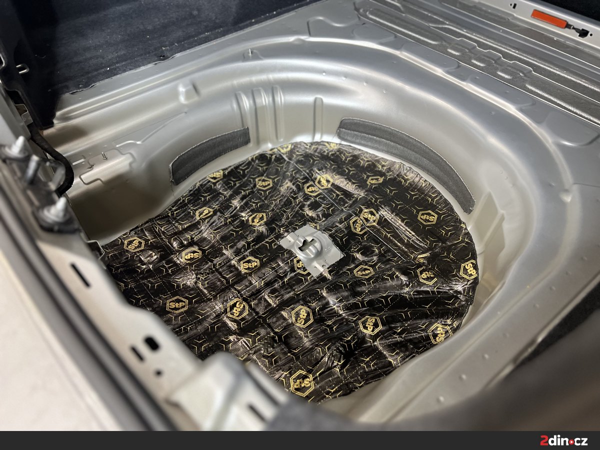 Jak bylo zmíněno v úvodu, aby nová audio sestava hrála nejlépe, jak dovede, věnovali jsme velkou pozornost odhlučnění klíčových oblastí vozu. Zaměřili jsme se především na dveře a kufr, kam zamířily nové komponenty a které jsou nejexponovanější z hlediska míry pronikání hluku a generování vibrací. Použili jsme kombinaci antivibračních materiálů STP Aggressive Silver a STP Black Gold Camo, zvukově izolačního CTK Multimat PRO a zvuk pohlcujícího materiálu StP Relief 15 Premium. Tato čtyřkombinace zajišťuje eliminaci rezonancí, potlačení hluku od aerodynamiky a cesty a příznivě ovlivňuje akustiku prostoru, ve kterém se nachází jak reproduktory, tak subwoofer.