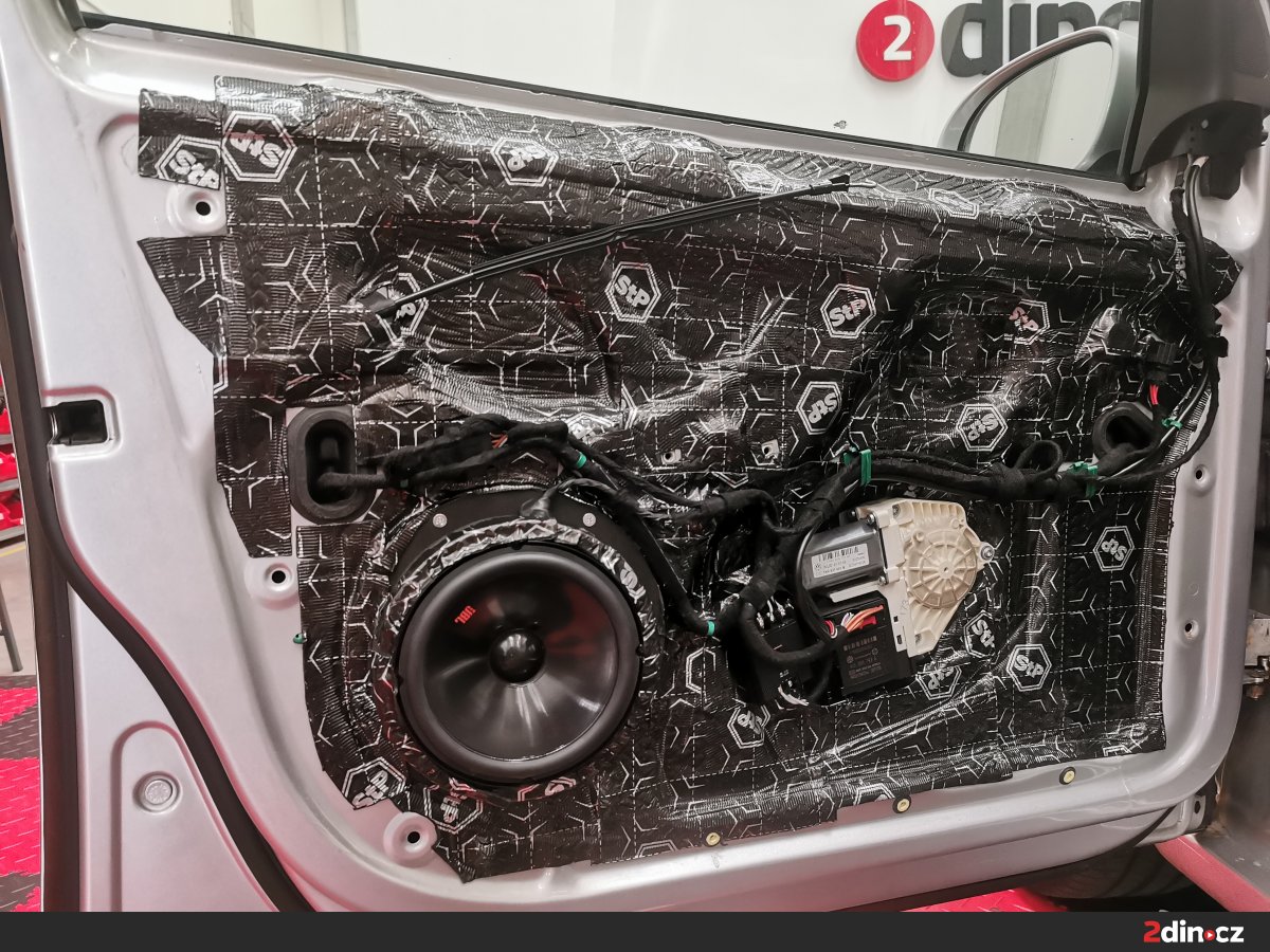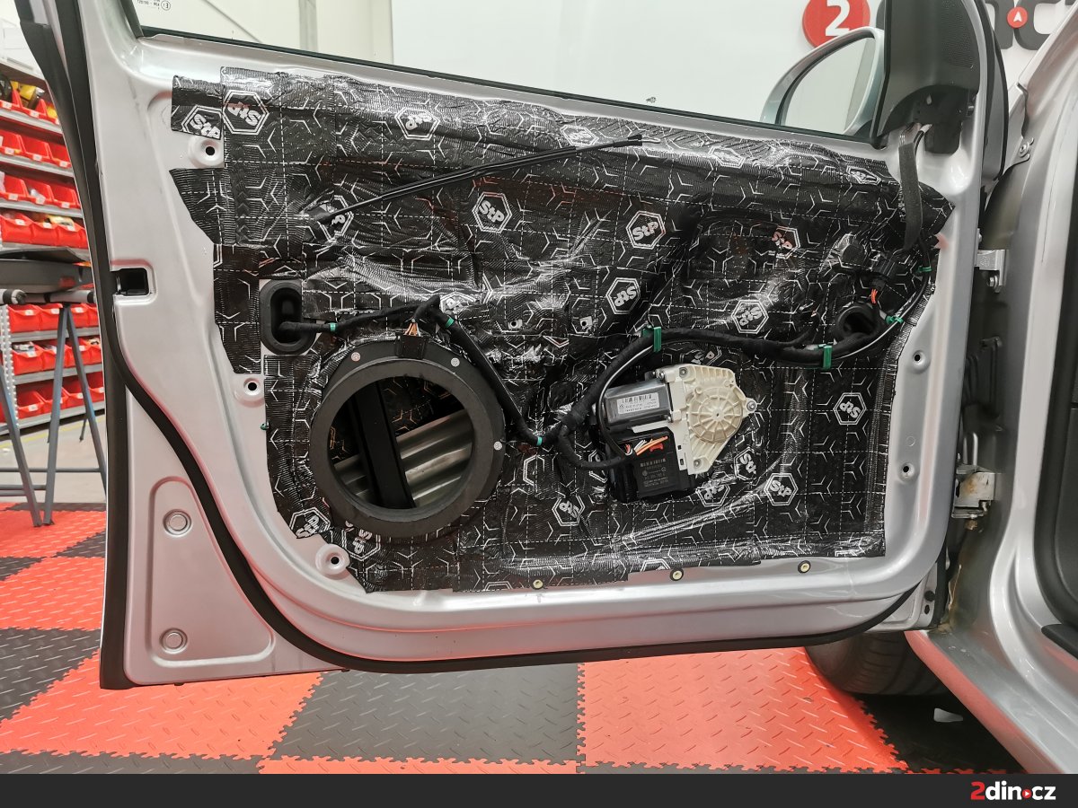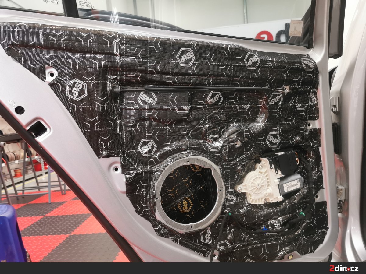 Dveře byly důkladně odhlučněny kombinací dvou antivibračních materiálů – STP Black Gold Camo pro hlavní plechové části a STP Black Silver pro vnitřní výplně. Tato kombinace významně zvyšuje tuhost dveří a eliminuje přenos vibrací, což přináší nejen snížení hluku, ale i pevnější zvukovou odezvu. Na vnitřní stranu byla dále aplikována vrstva STP AeroFlex 3 mm, která díky svým termoakustickým vlastnostem efektivně tlumí zbytkové zvuky a zároveň přispívá k tepelné izolaci. Výsledkem je tichý a stabilní dveřní prostor vhodný pro montáž nových reproduktorů.