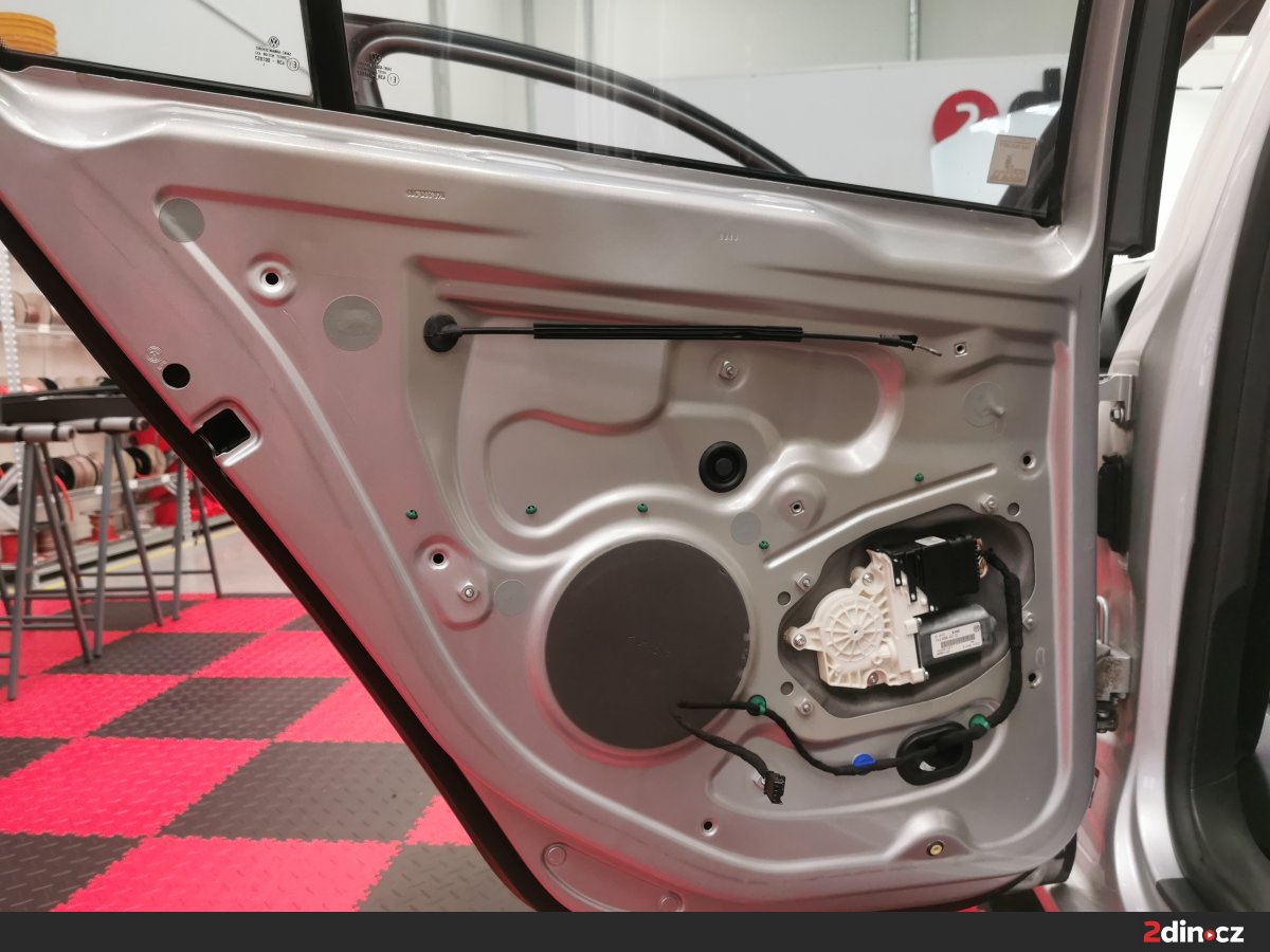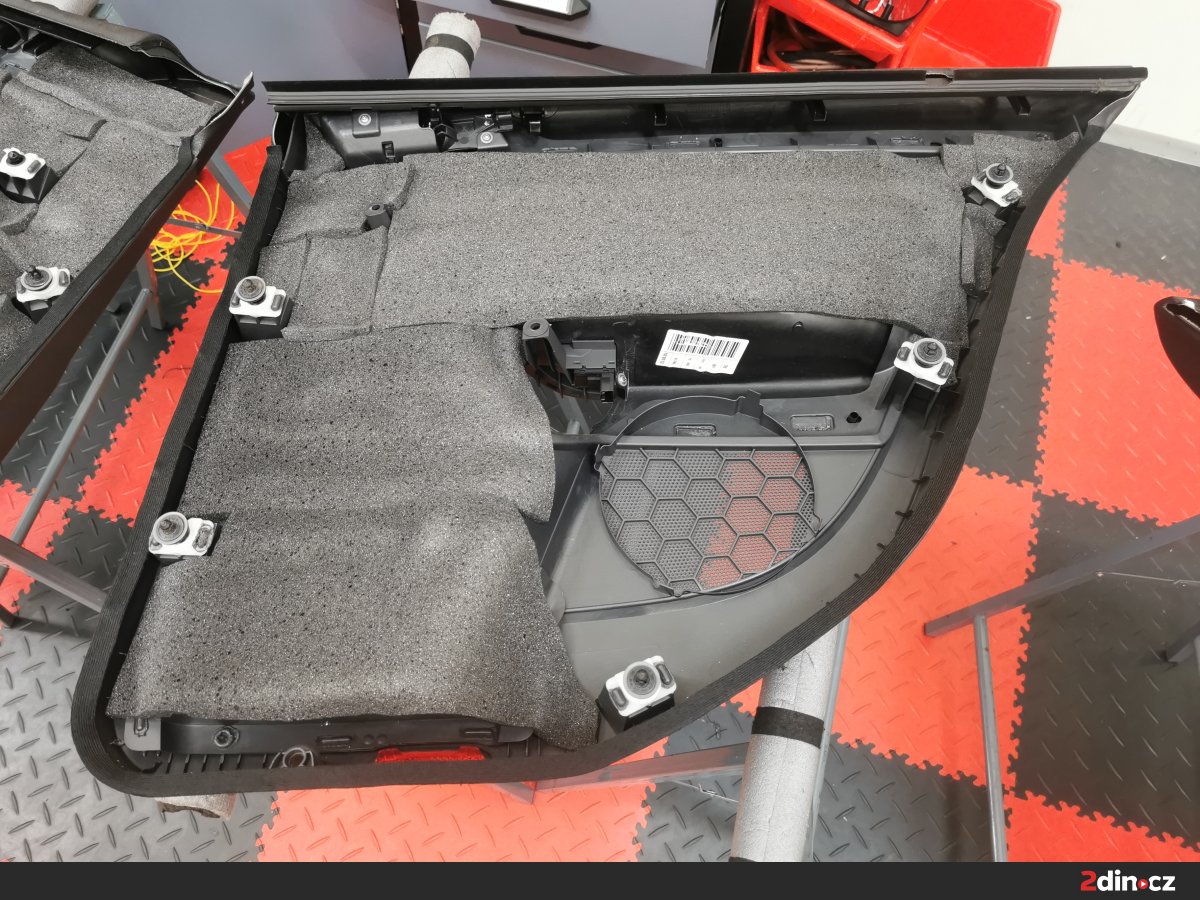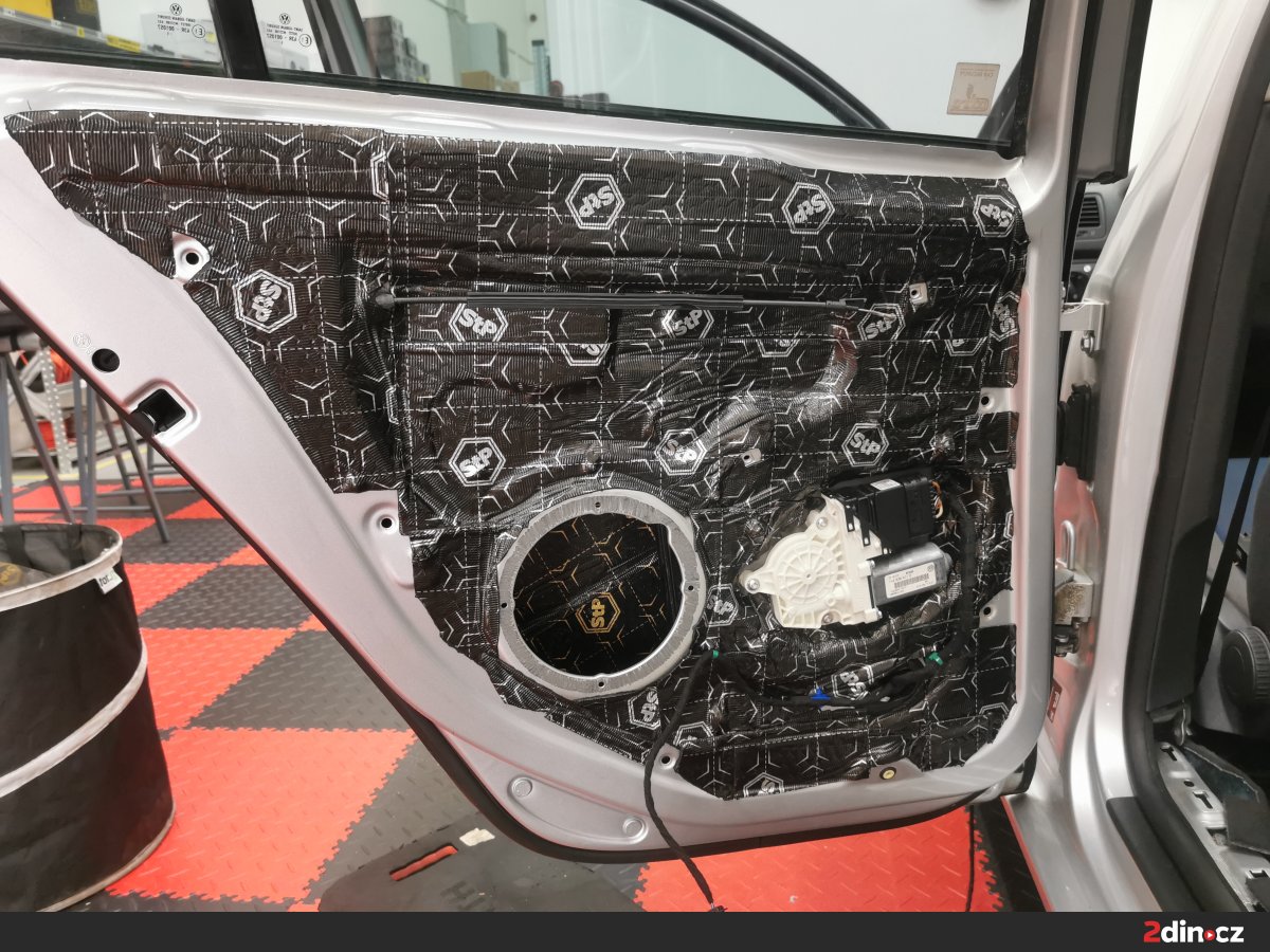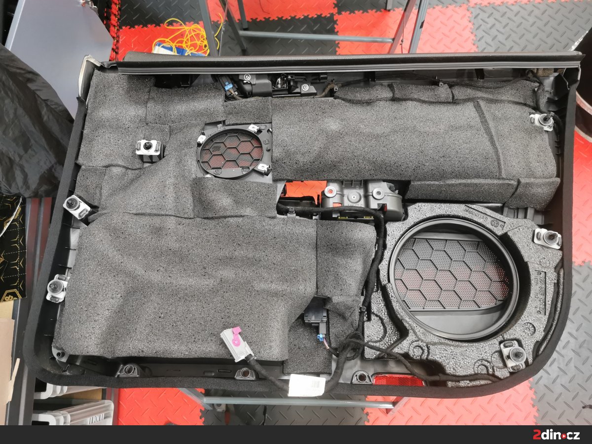 Dveře byly důkladně odhlučněny kombinací dvou antivibračních materiálů – STP Black Gold Camo pro hlavní plechové části a STP Black Silver pro vnitřní výplně. Tato kombinace významně zvyšuje tuhost dveří a eliminuje přenos vibrací, což přináší nejen snížení hluku, ale i pevnější zvukovou odezvu. Na vnitřní stranu byla dále aplikována vrstva STP AeroFlex 3 mm, která díky svým termoakustickým vlastnostem efektivně tlumí zbytkové zvuky a zároveň přispívá k tepelné izolaci. Výsledkem je tichý a stabilní dveřní prostor vhodný pro montáž nových reproduktorů.