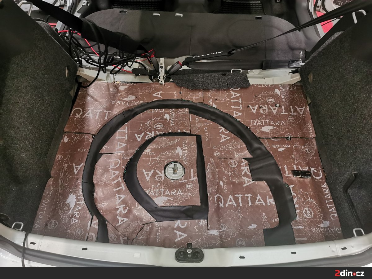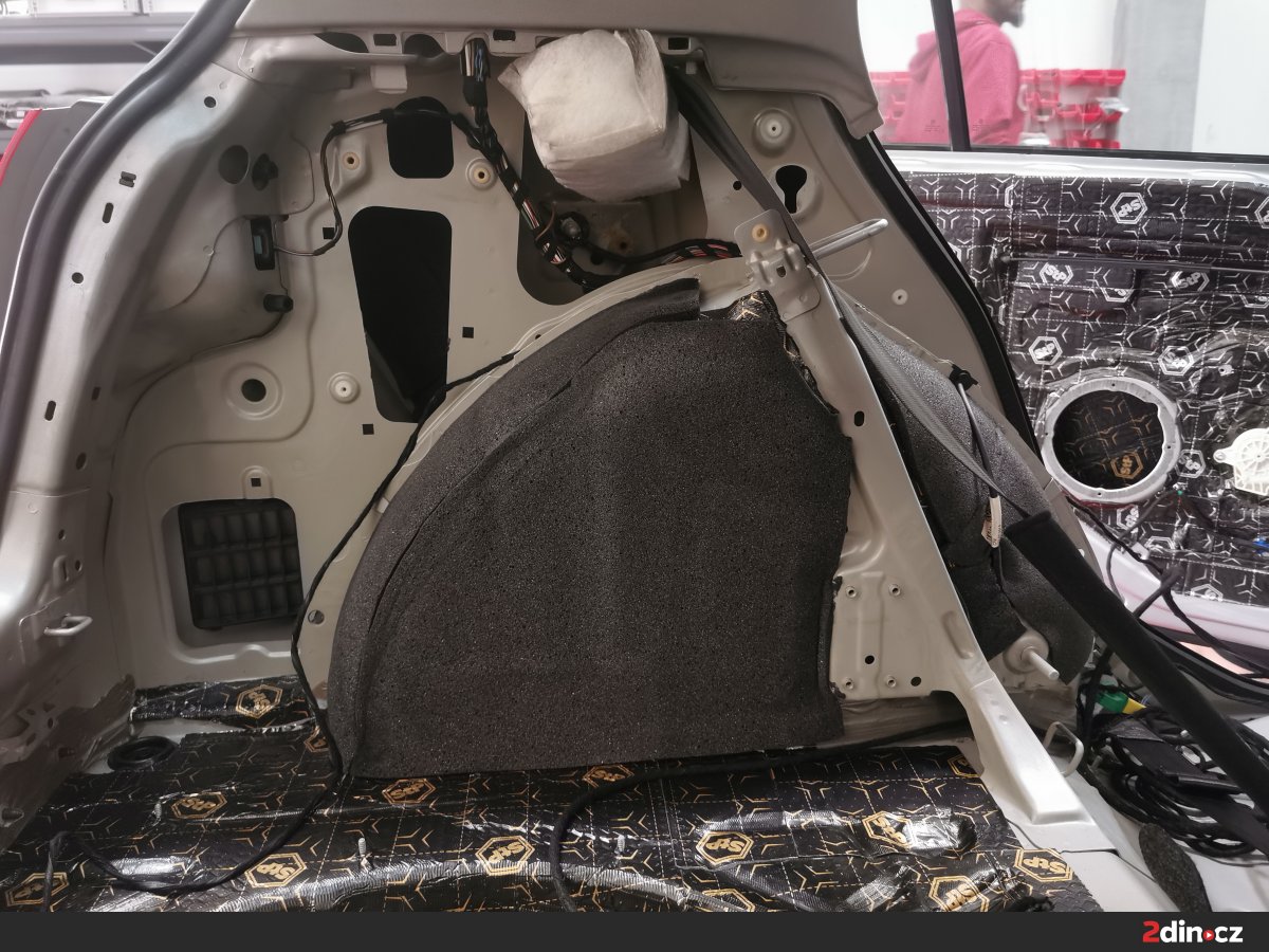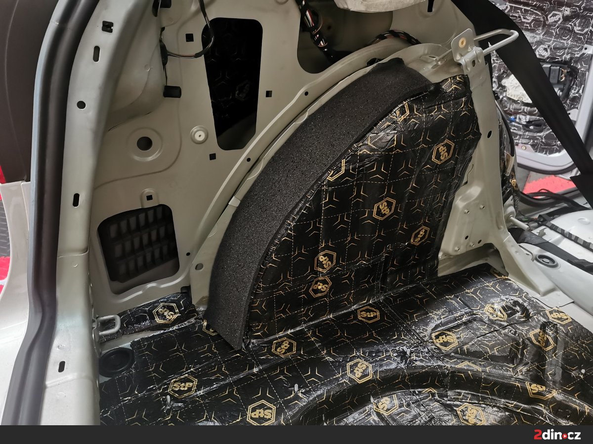 Také prostor kufru, z hlediska akustiky často podceňovaný, dostal profesionální péči. První vrstvu tvořil antivibrační materiál STP Black Gold Camo pro eliminaci plechových rezonancí. Následovala kombinace protihlukového materiálu STP Qattara a STP AeroFlex 3 mm, které v součinnosti tlumí nízkofrekvenční hluk od podvozku a zároveň zlepšují tepelný komfort. Tato úprava nejen ztišila zavazadlový prostor, ale zároveň připravila ideální základnu pro instalaci aktivního subwooferu.
