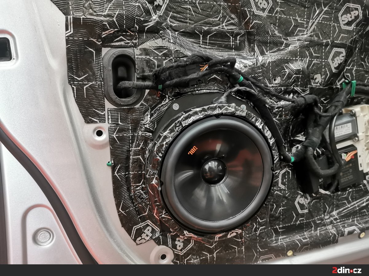 Subwoofer se samozřejmě nemohl obejít bez reproduktorů – zvolili jsme modely JBL Stage3 607C a JBL Stage3 627. Komponentní systém na předních dveřích poskytuje výborné oddělení výškového a středobasového spektra, zatímco koaxiální reproduktory vzadu zajišťují rovnoměrné rozložení zvuku. Tyto reproduktory vynikají vysokou citlivostí, výbornou dynamikou a muzikálním podáním bez zkreslení. Díky jejich instalaci do odhlučněného prostoru naplno využívají svůj potenciál a poskytují kvalitní zvuk i při běžném poslechu bez potřeby externího zesilovače.