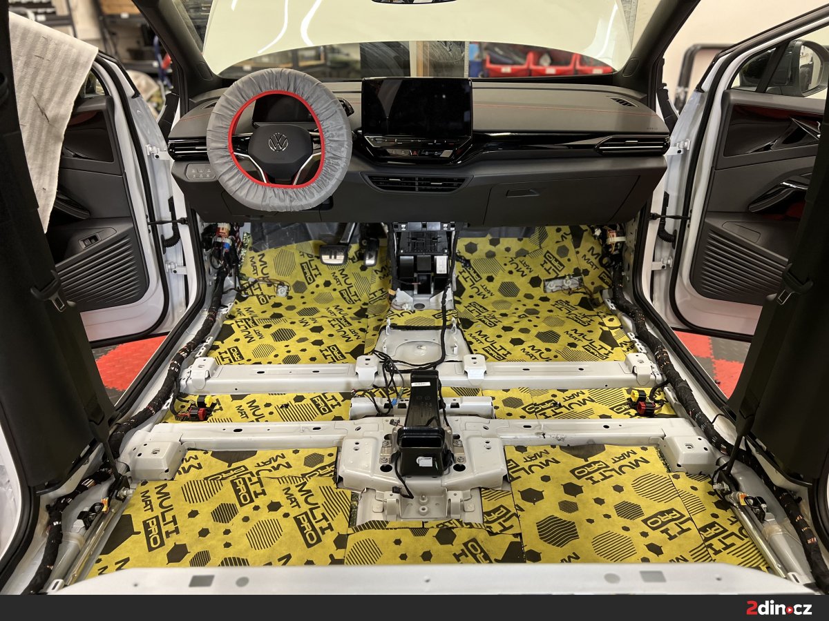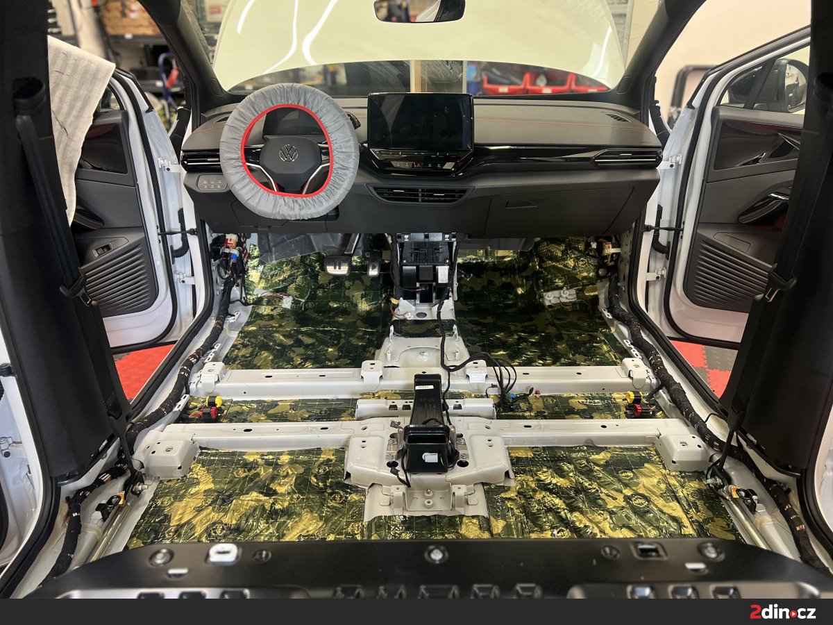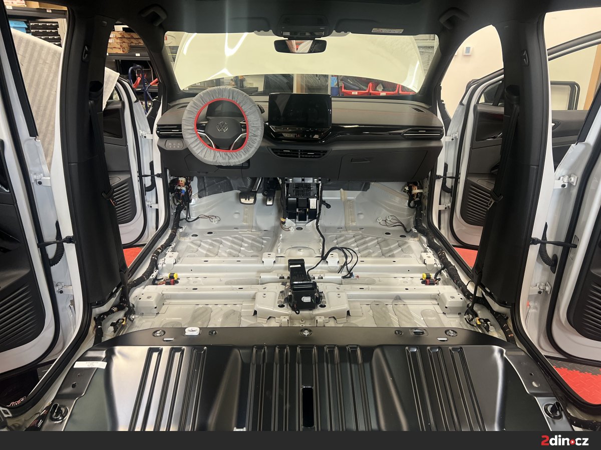 Podlaha je nejen u VW ID.4 zásadním zdrojem hluku, protože právě přes spodní část karoserie se do interiéru přenáší valivý hluk od pneumatik, vibrace od náprav a hluk vznikající při jízdě po hrubším asfaltu. U elektromobilů je tento problém ještě znatelnější, protože chybí zvuk motoru, který by část těchto ruchů přirozeně překryl. Jako základ byla použita vrstva antivibračního materiálu STP Black Gold, která zpevňuje plech a snižuje přenos vibrací. Na ni navazovaly zvukově izolační materiály CTK Multimat EVO a CTK Multimat PRO, které pomáhají omezit prostup hluku od podvozku do kabiny. V místech, kde bylo potřeba pracovat s tepelně-akustickou izolací a zachovat prostor pro zpětnou montáž interiéru, byl použit STP AeroFlex 3.