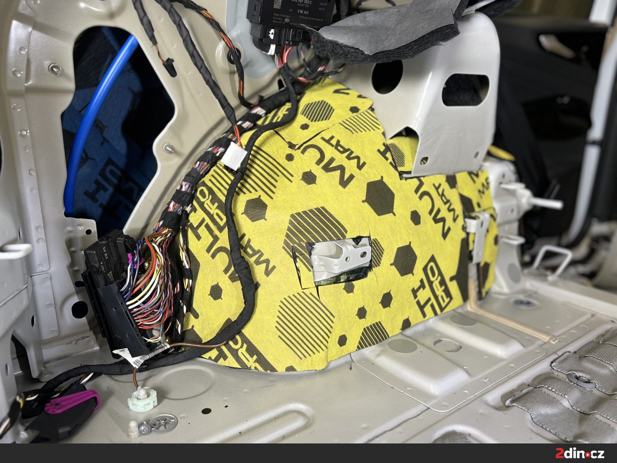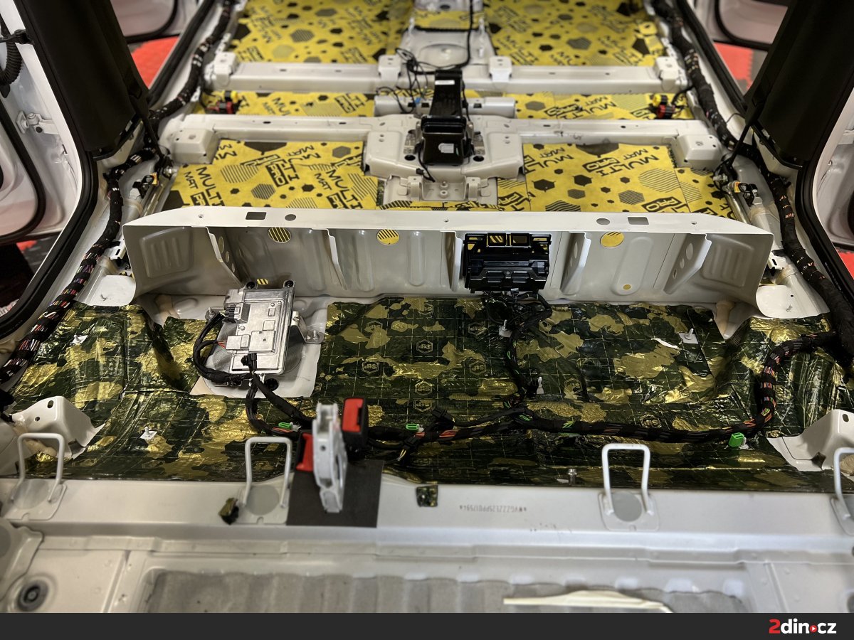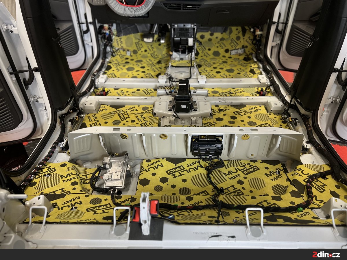 Podlaha je nejen u VW ID.4 zásadním zdrojem hluku, protože právě přes spodní část karoserie se do interiéru přenáší valivý hluk od pneumatik, vibrace od náprav a hluk vznikající při jízdě po hrubším asfaltu. U elektromobilů je tento problém ještě znatelnější, protože chybí zvuk motoru, který by část těchto ruchů přirozeně překryl. Jako základ byla použita vrstva antivibračního materiálu STP Black Gold, která zpevňuje plech a snižuje přenos vibrací. Na ni navazovaly zvukově izolační materiály CTK Multimat EVO a CTK Multimat PRO, které pomáhají omezit prostup hluku od podvozku do kabiny. V místech, kde bylo potřeba pracovat s tepelně-akustickou izolací a zachovat prostor pro zpětnou montáž interiéru, byl použit STP AeroFlex 3.