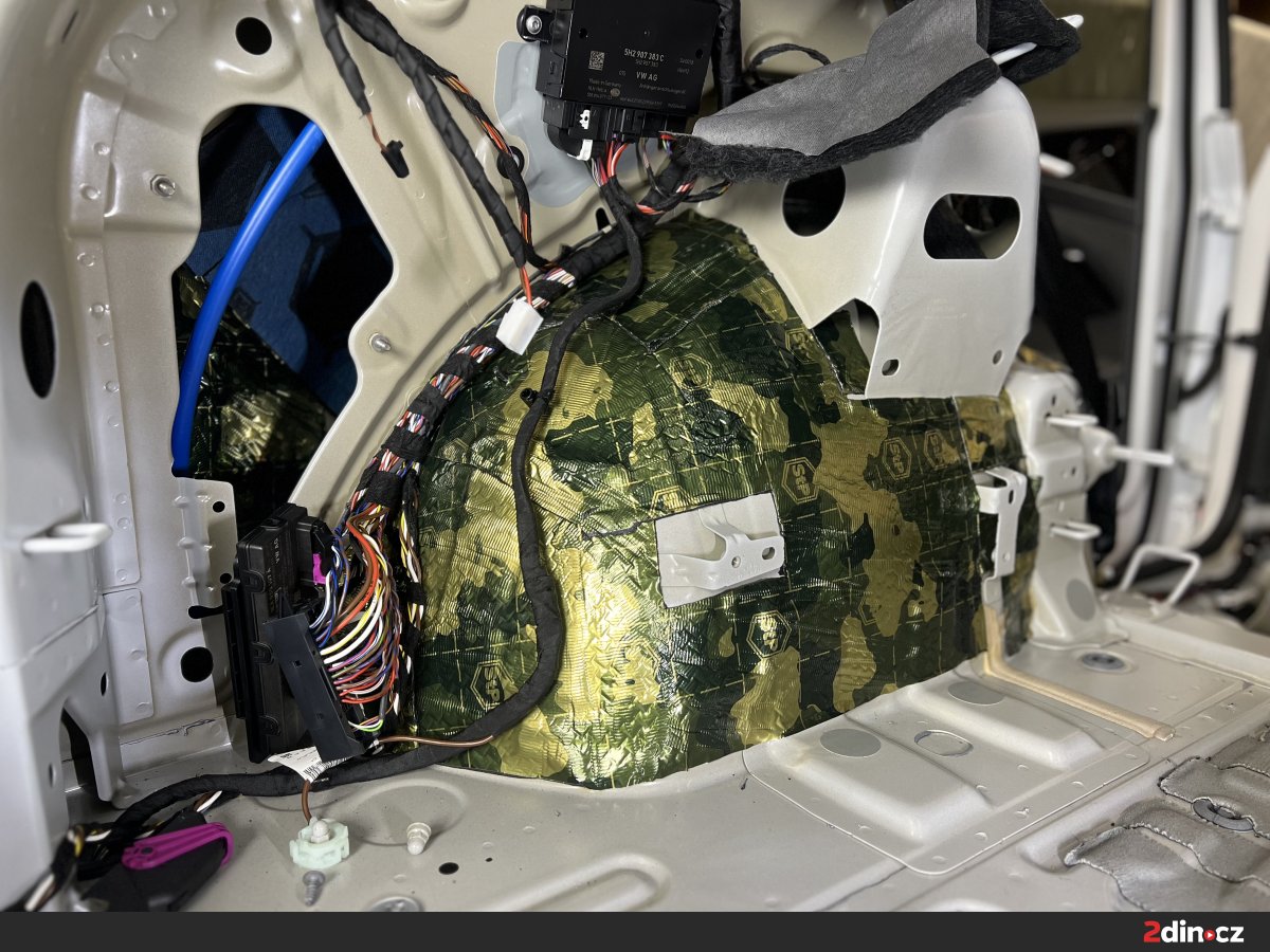 Také podběhy z hlediska hluku patří mezi výrazně zatížené části automobilu – vzniká zde totiž intenzivní valivý hluk od pneumatik, rázy od nerovností, šum vody, kamínků a vibrace přenášené od podvozku. V rámci této konkrétní montáže jsme je ošetřili zevnitř kabiny pomocí antivibračního materiálu STP Black Gold, který omezuje rezonance a zpevňuje konstrukci. Na vybrané části byl doplněn STP Aggressive Silver vhodný pro přesné zpevnění méně přístupných nebo tvarově složitějších míst. Následně byly aplikovány zvukově izolační materiály CTK Multimat EVO a CTK Multimat PRO, které pomáhají výrazně snížit průnik hluku od kol.