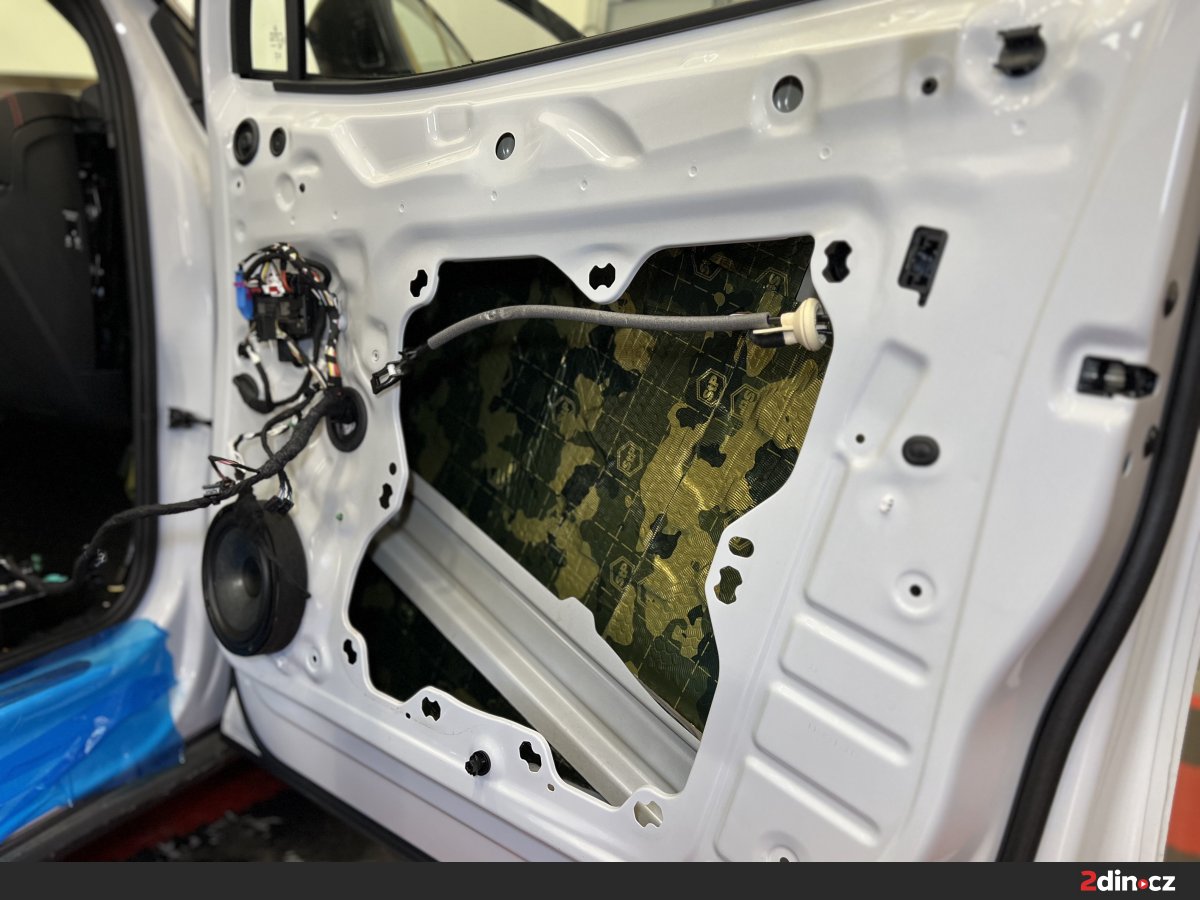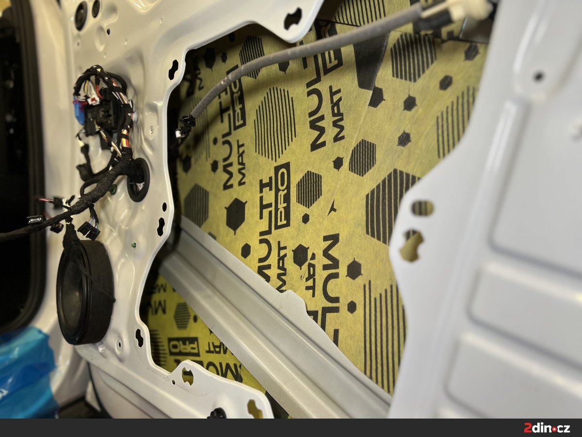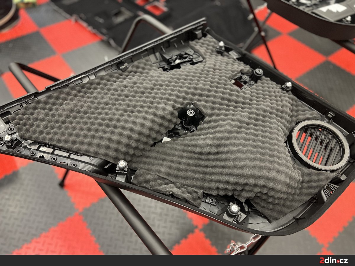 Dveře byly jednou z klíčových částí celé montáže, protože se podílejí nejen na přenosu okolního hluku do kabiny, ale také výrazně ovlivňují kvalitu reprodukce hudby. Nejprve jsme ošetřili plechové části dveří antivibračními materiály STP Black Gold a STP Aggressive Silver. Tyto vrstvy zpevňují konstrukci dveří, omezují rezonance a brání tomu, aby se tenký plech choval jako vibrující plocha. Díky správné aplikaci vzniká stabilnější základ pro reproduktory a dveře zároveň působí pevnějším a hodnotnějším dojmem. Na tapecírung byl použit materiál pohlcující zvuk StP Relief 15 Premium, který pomáhá snižovat hluk prostupující do interiéru a zároveň odděluje plastové části od kovové konstrukce. Tím se výrazně omezuje vrzání, drnčení a nežádoucí pazvuky.