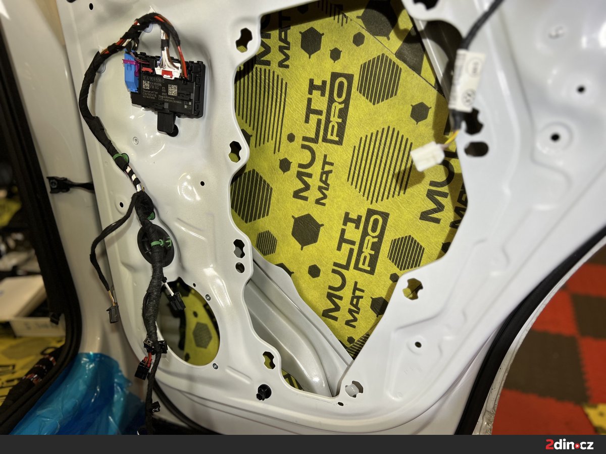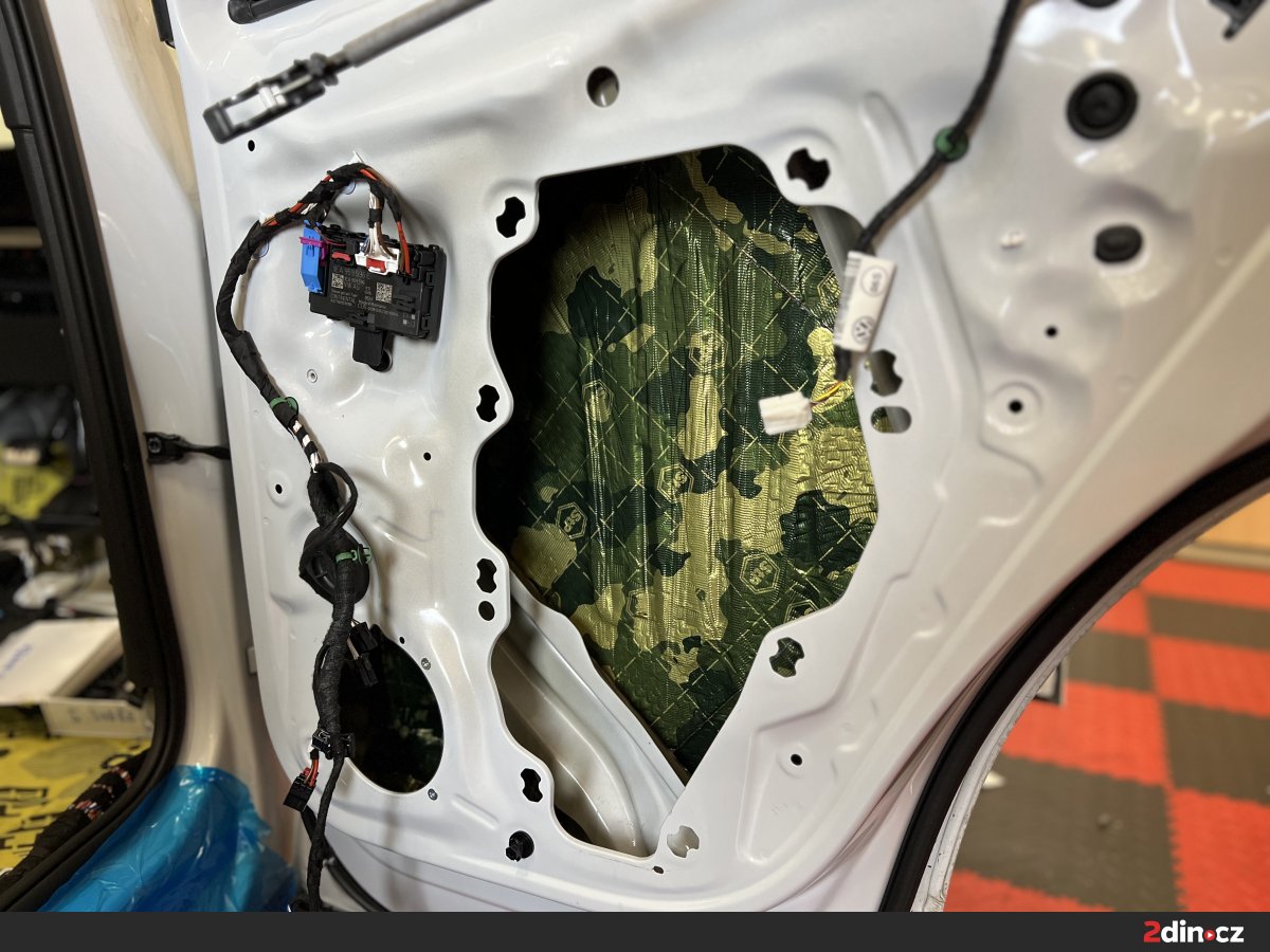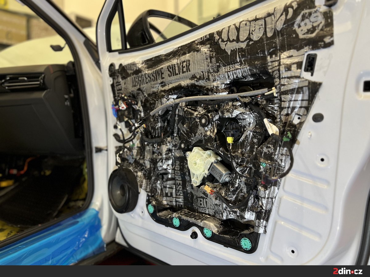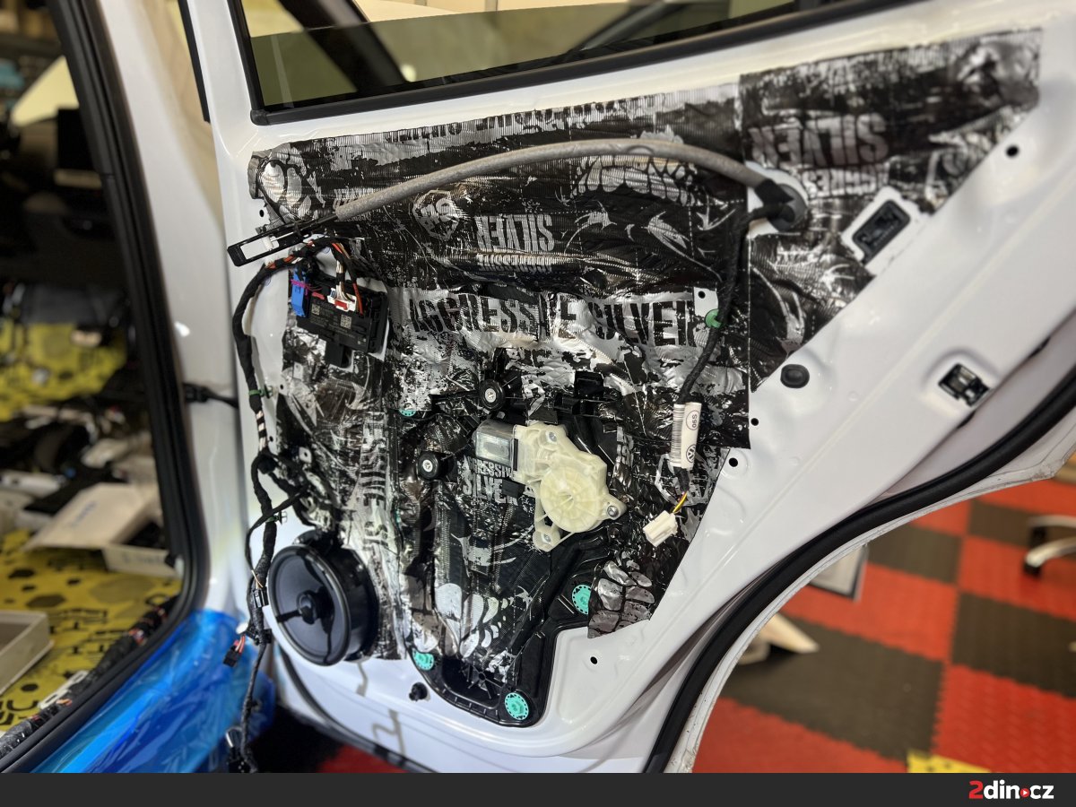 Dveře byly jednou z klíčových částí celé montáže, protože se podílejí nejen na přenosu okolního hluku do kabiny, ale také výrazně ovlivňují kvalitu reprodukce hudby. Nejprve jsme ošetřili plechové části dveří antivibračními materiály STP Black Gold a STP Aggressive Silver. Tyto vrstvy zpevňují konstrukci dveří, omezují rezonance a brání tomu, aby se tenký plech choval jako vibrující plocha. Díky správné aplikaci vzniká stabilnější základ pro reproduktory a dveře zároveň působí pevnějším a hodnotnějším dojmem. Na tapecírung byl použit materiál pohlcující zvuk StP Relief 15 Premium, který pomáhá snižovat hluk prostupující do interiéru a zároveň odděluje plastové části od kovové konstrukce. Tím se výrazně omezuje vrzání, drnčení a nežádoucí pazvuky.