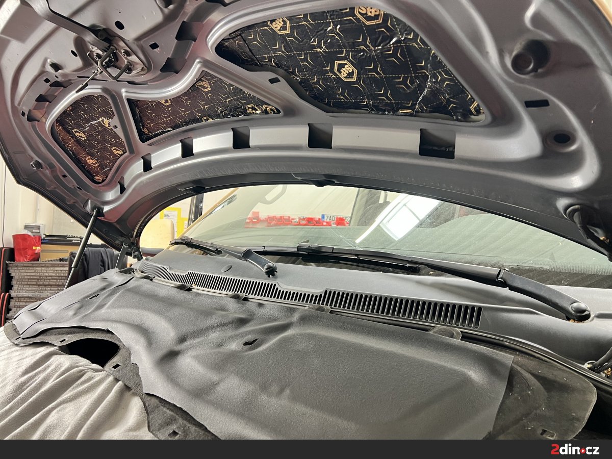 Motorová část je u automobilů vždy kritická, protože při akceleraci, jízdě do kopce nebo ve vyšších rychlostech se zvuk pohonného agregátu snadno přenáší do prostoru posádky. Proto jsme se zaměřili nejen na kapotu, ale také na mezimotorový prostor, kde je možné účinně omezit prostup hluku směrem do kabiny. Na vhodné kovové části byly aplikovány antivibrační materiály STP Black Gold a STP Aggressive Silver, které zpevňují plech, snižují jeho rezonance a zabraňují přenosu vibrací. Jako další vrstva byl použit termoakustický materiál STP AeroFlex 10, jenž pomáhá tlumit hluk a zároveň lépe pracuje s tepelnou zátěží v této oblasti. Odhlučnění vozu v motorové části má velký přínos hlavně při delších cestách, kdy monotónní hluk motoru zvyšuje únavu řidiče.