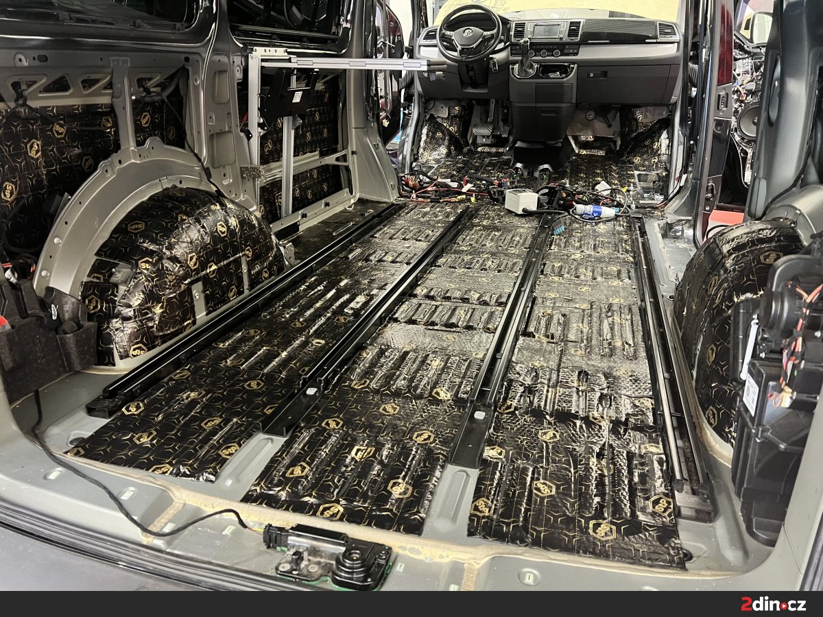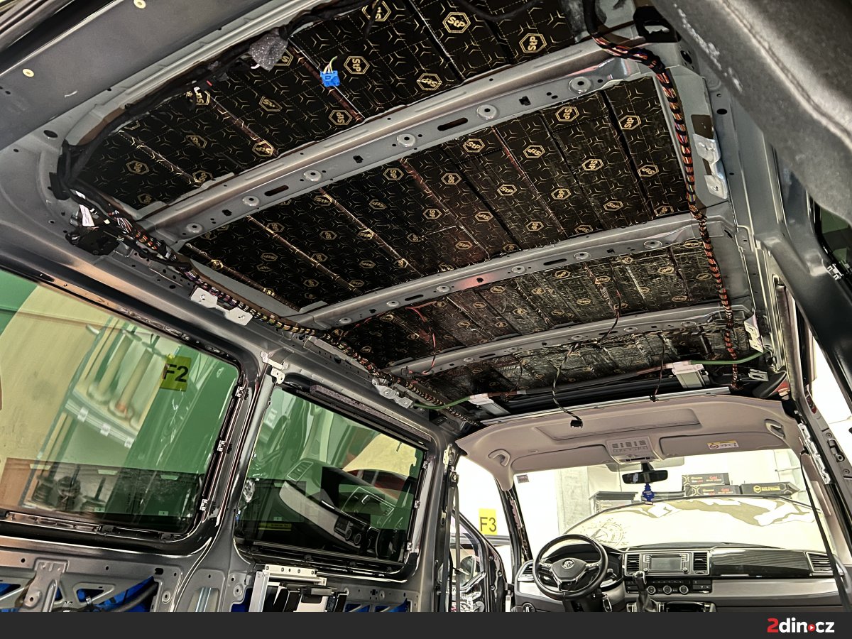 Vydali jsme se osvědčenou a spolehlivou cestou našeho balíčku odhlučnění Premium Plus, který zahrnuje komplexní ošetření celého vozu včetně dveří, podlahy, stropu, kufru, podběhů, mezimotoru a kapoty. Součástí montáže byl také upgrade audio sestavy, aby Multivan získal nejen výrazně klidnější interiér, ale i takový, ve kterém to skvěle hraje.