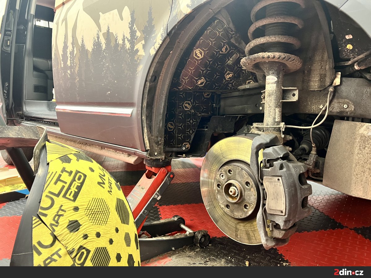 Podběhy patří mezi nejhlučnější části karoserie, protože jsou přímo vystavené práci pneumatik, kamínkům, vodě, nerovnostem i vibracím od podvozku. Právě odtud často přichází výrazný valivý hluk, který se následně přenáší do podlahy, kufru a bočních částí vozu. Při odhlučnění podběhů jsme použili kombinaci antivibračních, zvukově izolačních a termoakustických materiálů. STP Black Gold a STP Aggressive Silver zpevňují kovové a vhodné plastové části, čímž snižují jejich rezonance. CTK Multimat EVO a CTK Multimat PRO pomáhají omezit prostup hluku směrem do interiéru. Termoakustický materiál STP AeroFlex 10 byl použit tam, kde bylo potřeba doplnit účinnou akustickou izolaci a zároveň zachovat odolnost materiálu.