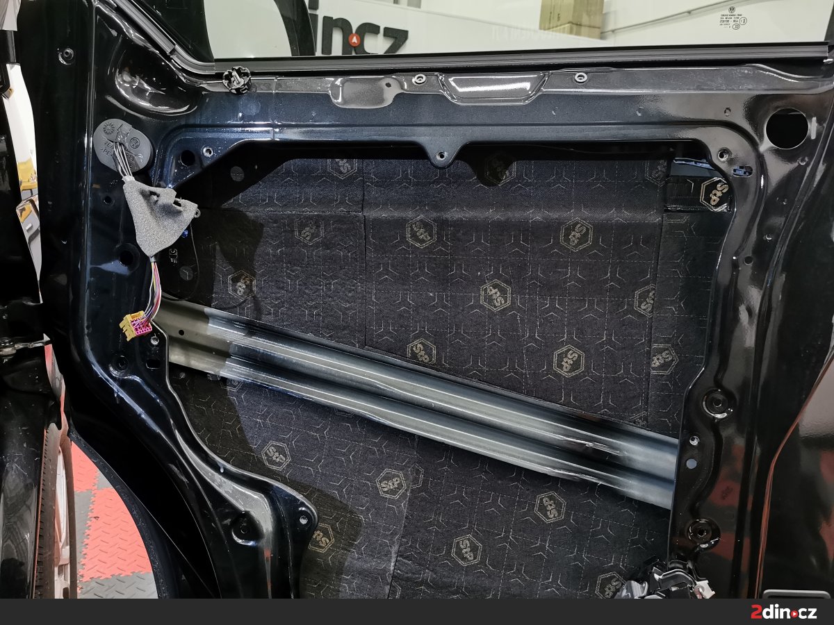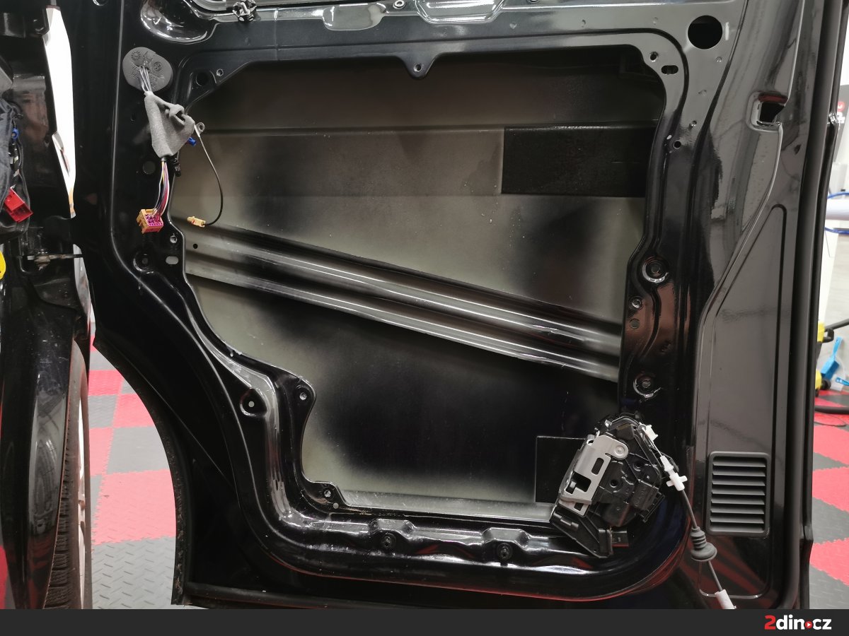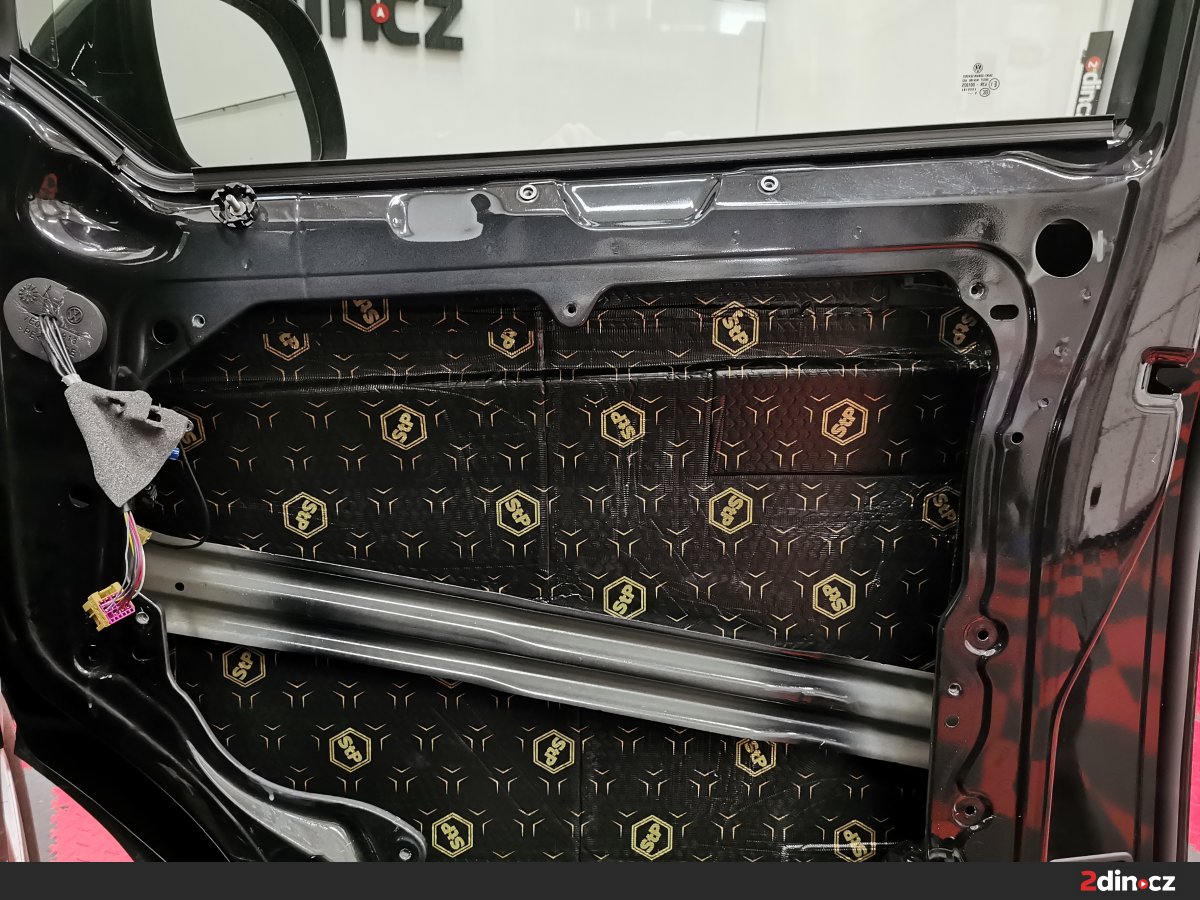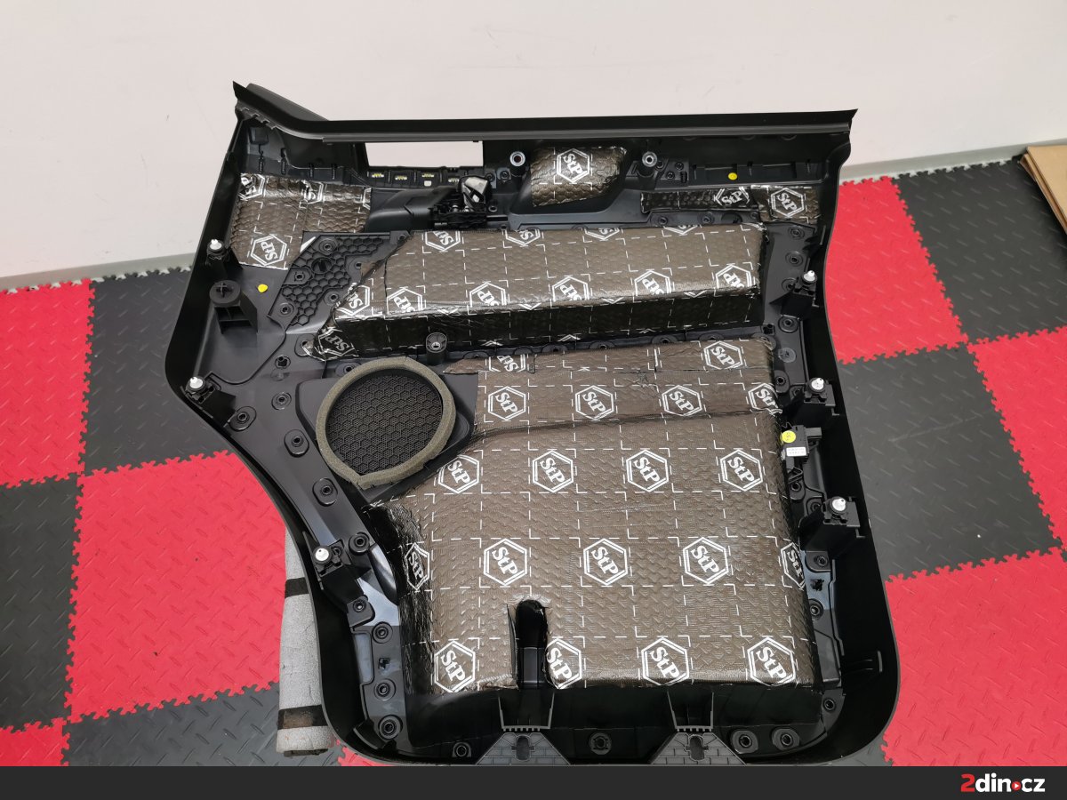 Prvním krokem bylo důkladné odhlučnění předních a zadních dveří, což je klíčový prvek pro kvalitní zvukový výkon reproduktorů. Použili jsme kombinaci antivibračních materiálů STP Black Silver a STP Black Gold Camo, které jsme aplikovali na vnitřní a vnější plechy dveří pro eliminaci rezonancí a zpevnění konstrukce. Pro finální úpravu jsme přidali protihlukový materiál STP Sonora, který pomáhá výrazně snížit pronikání hluku zvenčí do kabiny a zlepšuje celkovou akustiku. Díky tomuto řešení hraje audio systém čistěji a s větší dynamikou i při nižších hlasitostech.