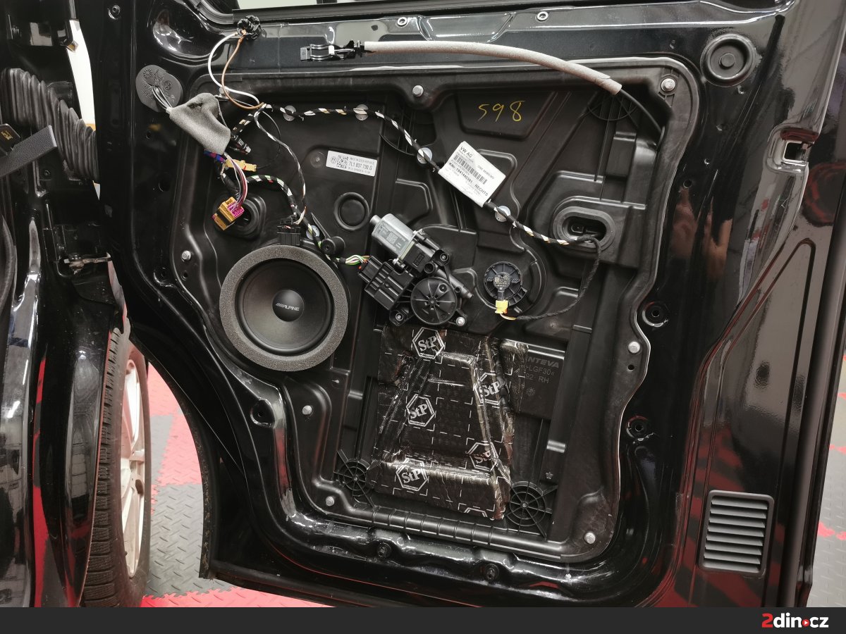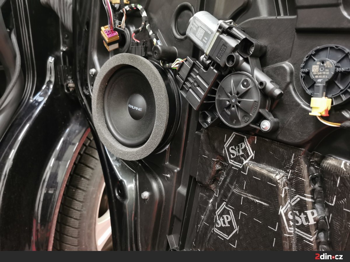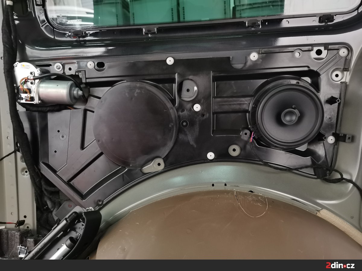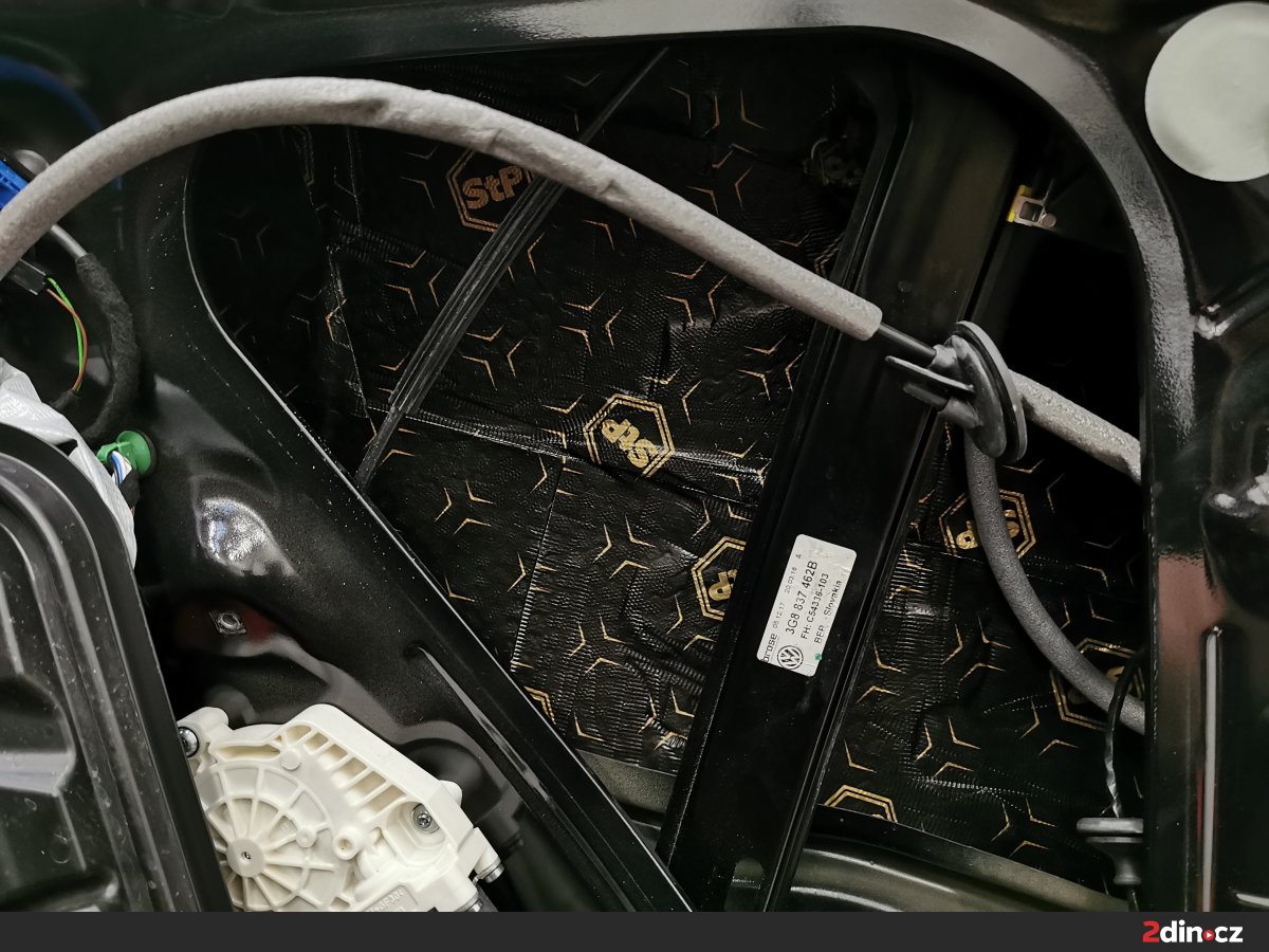 Prvním krokem bylo důkladné odhlučnění předních a zadních dveří, což je klíčový prvek pro kvalitní zvukový výkon reproduktorů. Použili jsme kombinaci antivibračních materiálů STP Black Silver a STP Black Gold Camo, které jsme aplikovali na vnitřní a vnější plechy dveří pro eliminaci rezonancí a zpevnění konstrukce. Pro finální úpravu jsme přidali protihlukový materiál STP Sonora, který pomáhá výrazně snížit pronikání hluku zvenčí do kabiny a zlepšuje celkovou akustiku. Díky tomuto řešení hraje audio systém čistěji a s větší dynamikou i při nižších hlasitostech.