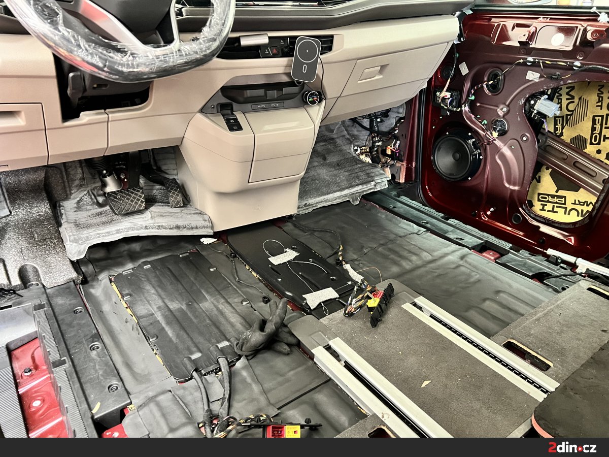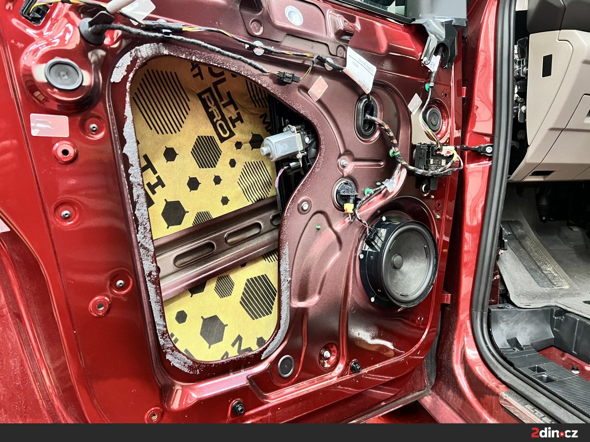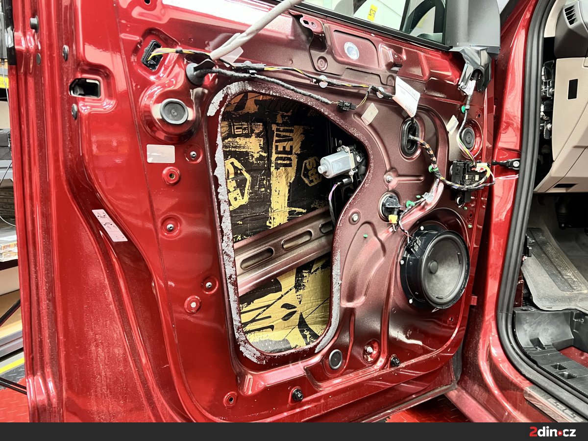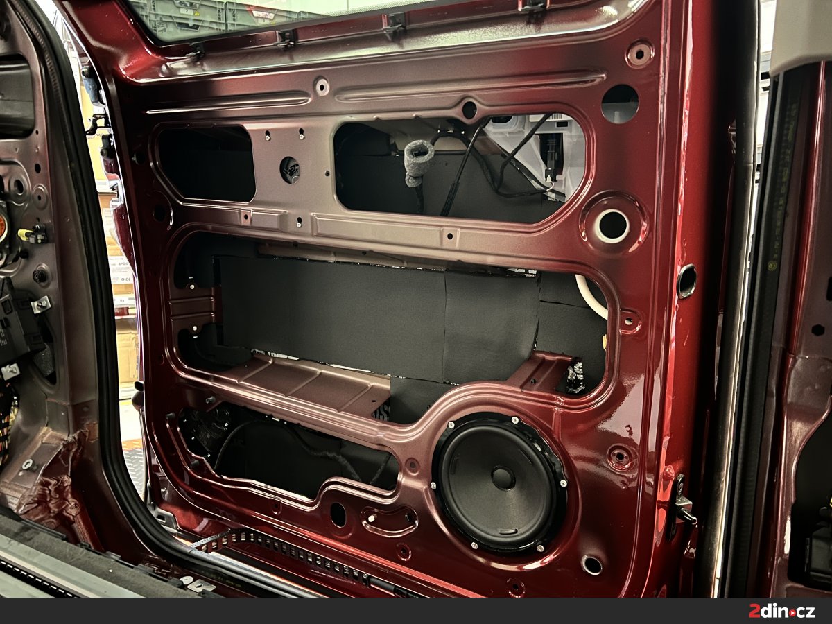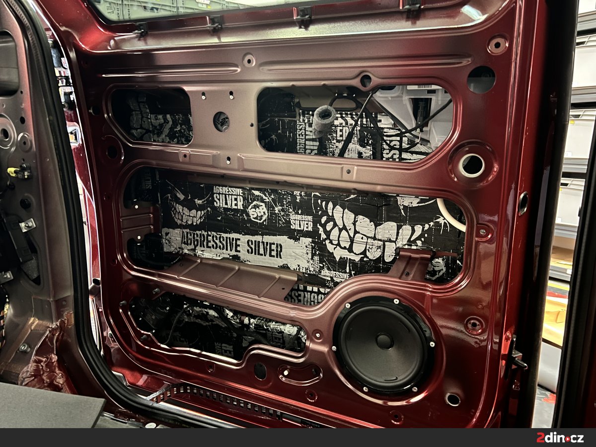 Přední i posuvné dveře byly opatřeny silnou vrstvou antivibračních materiálů STP Aggressive Silver a STP Devil's Gold. Tato kombinace zajišťuje maximální zpevnění vnějších i vnitřních plechů, eliminuje rezonance a zároveň připravuje ideální podmínky pro kvalitní práci reproduktorů. V další vrstvě byla aplikována akustická pěna StP Relief 15 Premium, která účinně pohlcuje zbytkový hluk pronikající zvenčí. Dveře byly navíc doplněny o finální ošetření okrajů pomocí antivrzacích prvků, čímž se odstranily veškeré pazvuky vznikající při jízdě. Výsledkem je pevný a tichý celek, který výrazně přispívá ke klidnému interiéru.