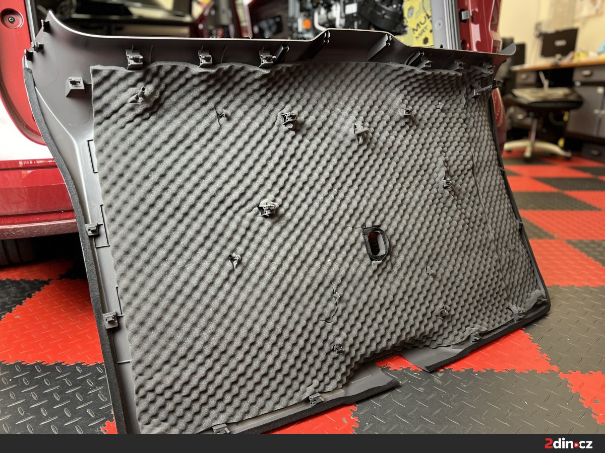 Zavazadlový prostor včetně víka pátých dveří byl odhlučněn totožným způsobem jako podlaha. V tomto konkrétním voze totiž volně přechází do prostoru kabiny, takže je zde nutné zvolit stejný postup, jako u ostatních rozsáhlých ploch. Kombinace antivibrační vrstvy STP Devil's Gold a zvukově izolační vrstvy CTK Multimat PRO přinesla masivní útlum hluku generovaného zadní nápravou a prostorem pod vozem. Díky této úpravě se i zadní část vozu stala akusticky klidným prostředím bez nepříjemného hučení a rezonancí, což ocení zejména posádka na zadních sedadlech.