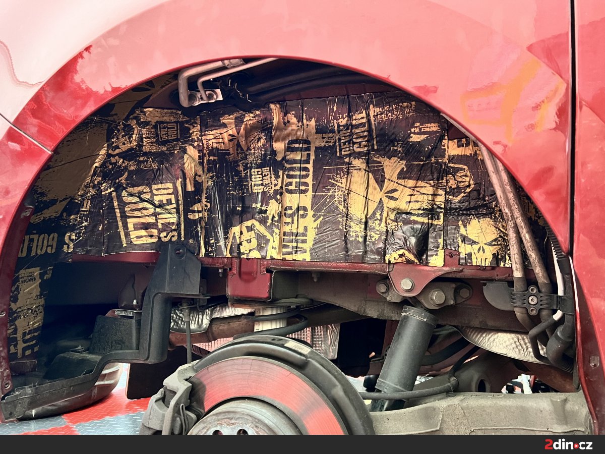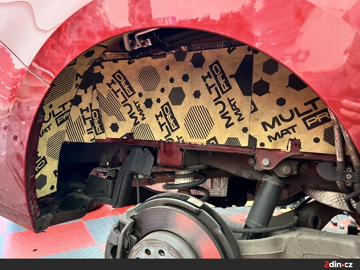 A nakonec zde máme podběhy, další důležitou část, skrz níž do interiéru proniká zejména valivý hluk od pneumatik a vozovky. Zaměřili jsme se na přední i zadní podběhy a odhlučnili je ve více vrstvách. Na kovové části karoserie byl aplikován antivibrační materiál STP Devil's Gold, který eliminuje vibrace a rezonance. Plastové části byly následně ošetřeny pomocí CTK Multimat PRO, který disponuje mimořádnými tlumicími vlastnostmi i ve vlhkém prostředí. Pomocí tohoto ošetření se nám podařilo výrazně snížit hluk přenášený od pneumatik, podvozku a vozovky přímo do kabiny.