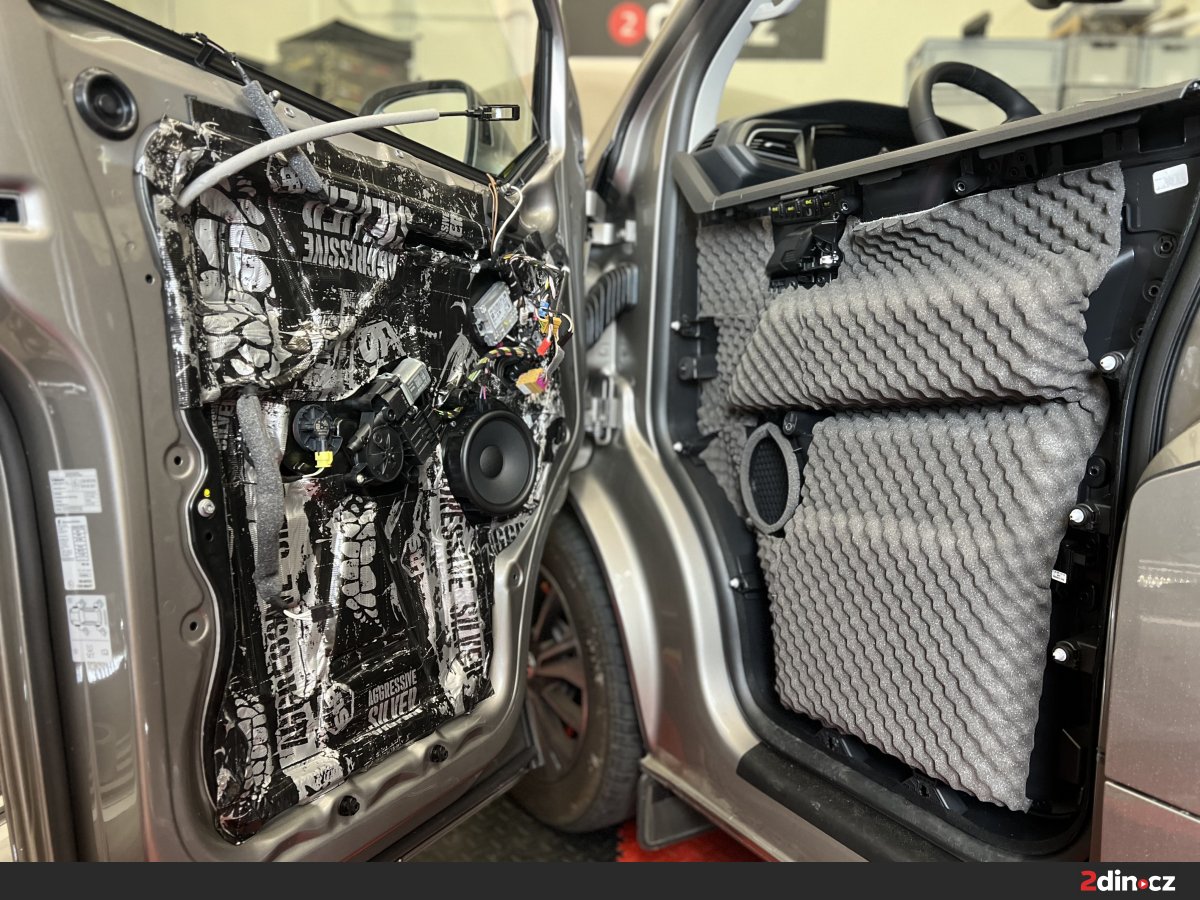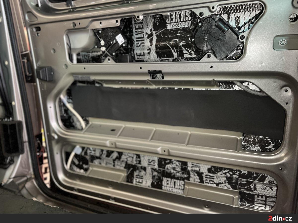 Dveře patří z hlediska akustického pohodlí v kabině k nejkritičtějším částem, a to především kvůli velkým plochám a minimální tovární izolaci. Nejprve jsme zde aplikovali antivibrační materiály STP Black Gold a STP Aggressive Silver na vnější i vnitřní plechy, čímž došlo k výraznému zpevnění konstrukce dveří a eliminaci rezonancí. Následně jsme přidali zvukově izolační sendvičové materiály CTK Multimat EVO a CTK Multimat PRO, které brání průniku hluku do interiéru. Tapecírung jsme doplnili akustickými materiály STP Biplast 10 a Silent Coat SA15 XL, které pohlcují zbytkový hluk a zároveň oddělují plastové části od plechové konstrukce. Díky této kombinaci vzniklo efektivní odhlučnění vozu s výrazným omezením vibrací i lepší akustikou.