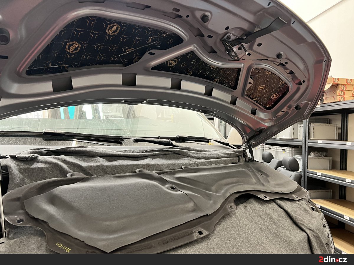 Když je řeč o hluku v autě, spoustu lidí jako první oprávněně napadne motor – spalovací jednotka je účinným generátorem hluku sama o sobě. Na kapotu jsme nejprve aplikovali antivibrační materiál STP Black Gold, který zpevnil plech a eliminoval rezonance. Druhou vrstvu tvořil termoakustický materiál STP AeroFlex 10, který pohlcuje hluk motoru a zároveň zlepšuje tepelnou izolaci. V kombinaci s ostatními částmi odhlučnění vozu tento zásah vedl k výraznému snížení mechanického hluku od motoru pronikajícího do interiéru. Toto řešení výrazně přispívá ke zpříjemnění prostředí v kabině, zejména při akceleraci a jízdě ve vyšších otáčkách.