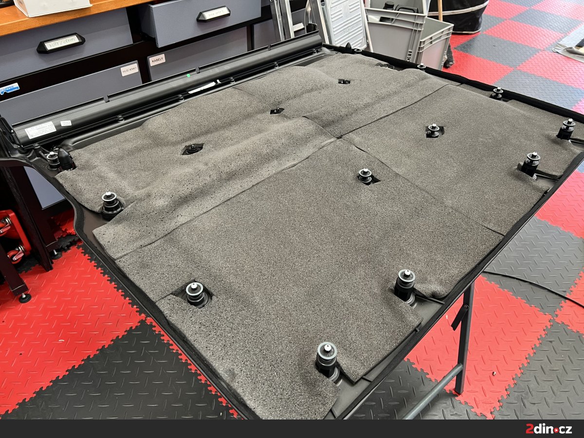 Podlaha je v autě jedním z největších zdrojů hluku, protože přenáší vibrace od podvozku, pneumatik i samotné konstrukce vozu. Nejprve jsme zde aplikovali antivibrační materiál STP Black Gold, který výrazně zpevnil plechovou podlahu a eliminoval přenos vibrací. Druhou vrstvu tvořily zvukově izolační materiály CTK Multimat EVO a CTK Multimat PRO, které zabraňují pronikání hluku do interiéru. Celou sestavu jsme doplnili termoakustickým materiálem STP AeroFlex 3, jenž pomáhá pohlcovat zbytkový hluk a zároveň zlepšuje tepelný komfort. Takto provedené odhlučnění výrazně snižuje míru hlučnosti a přispívá ke ztišení interiéru, zejména při dálničních rychlostech.