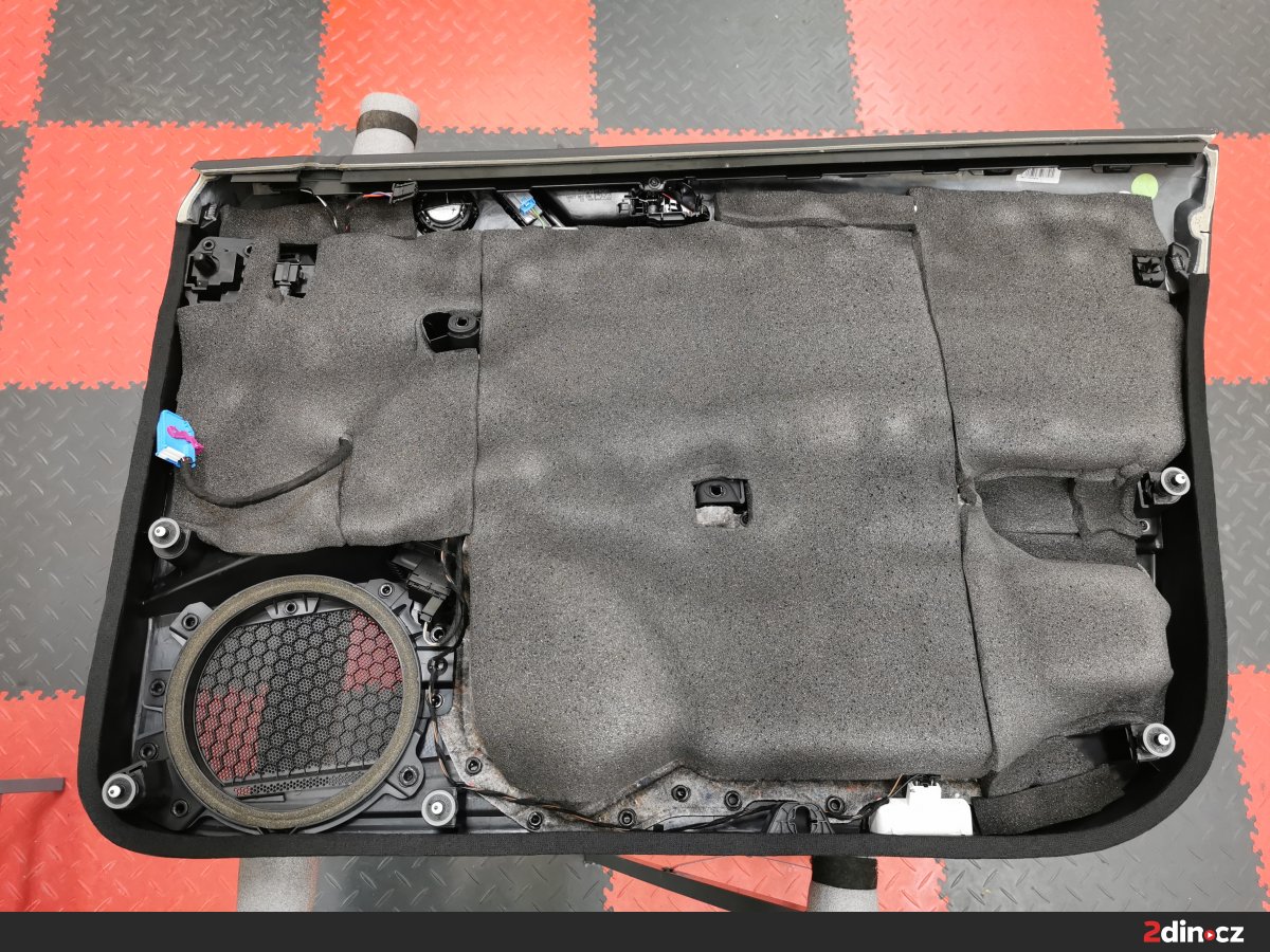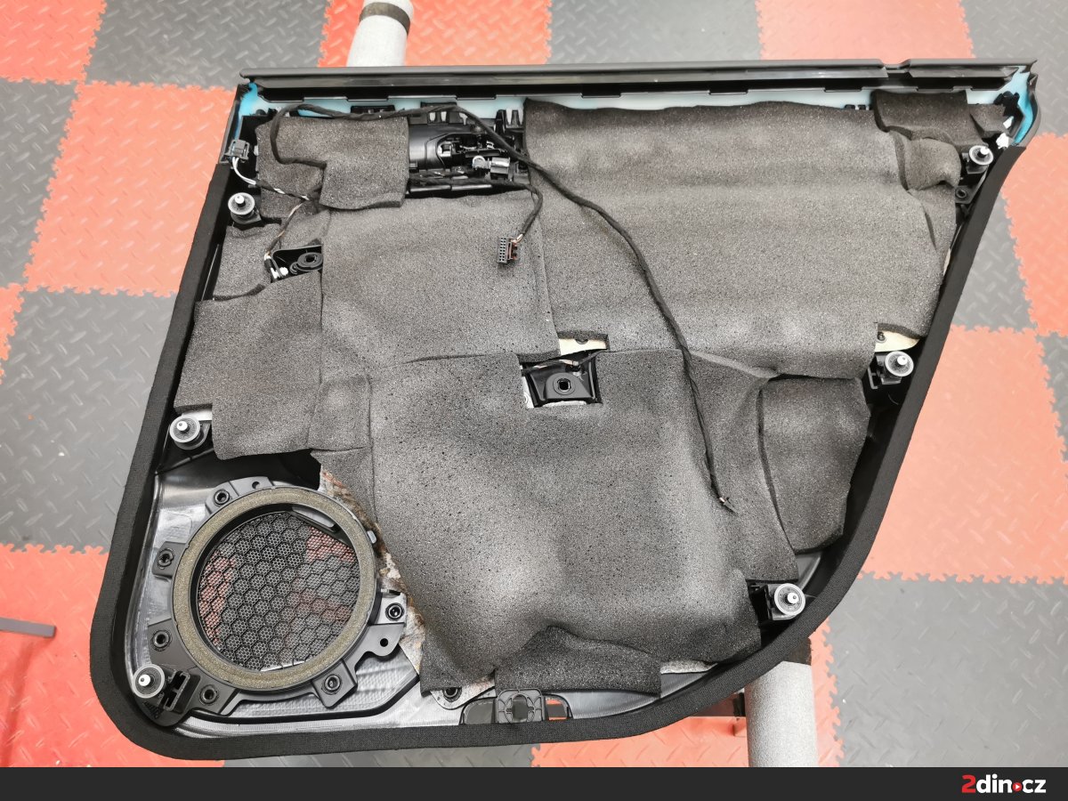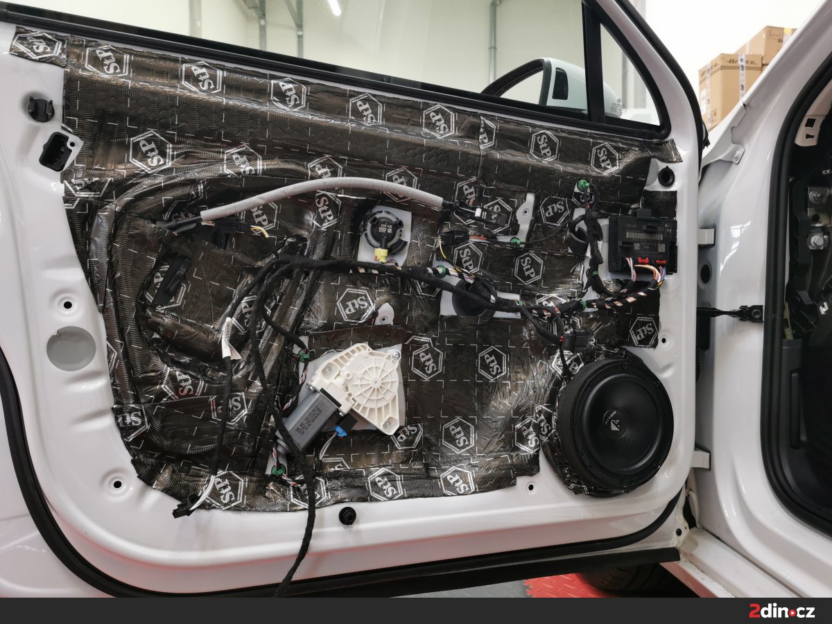 Ještě než jsme se pustili do montáže nových komponentů audio sestavy, odhlučnili jsme dveře a strop. Zejména u dveří je to důležité z toho důvodu, že správné ošetření z nich umožňuje vytvořit kvalitní ozvučnici, kde mají reproduktory lepší podmínky k tomu, aby naplno vynikly jejich kvality. V tomto případě jsme dveře i strop vozu ošetřili kombinací materiálů STP Black Gold Camo, STP Black Silver, CTK Multimat EVO, CTK Multimat PRO a STP Biplast 10, tedy antivibračních a protihlukových materiálů. Tento postup vedl k výraznému snížení hluku, eliminaci vibrací a lepší reprodukci středových frekvencí a výšek.