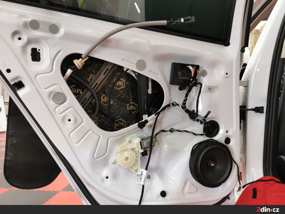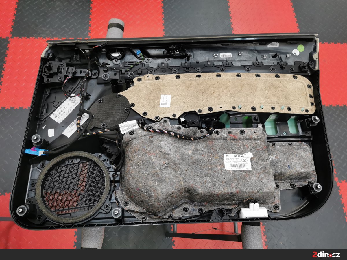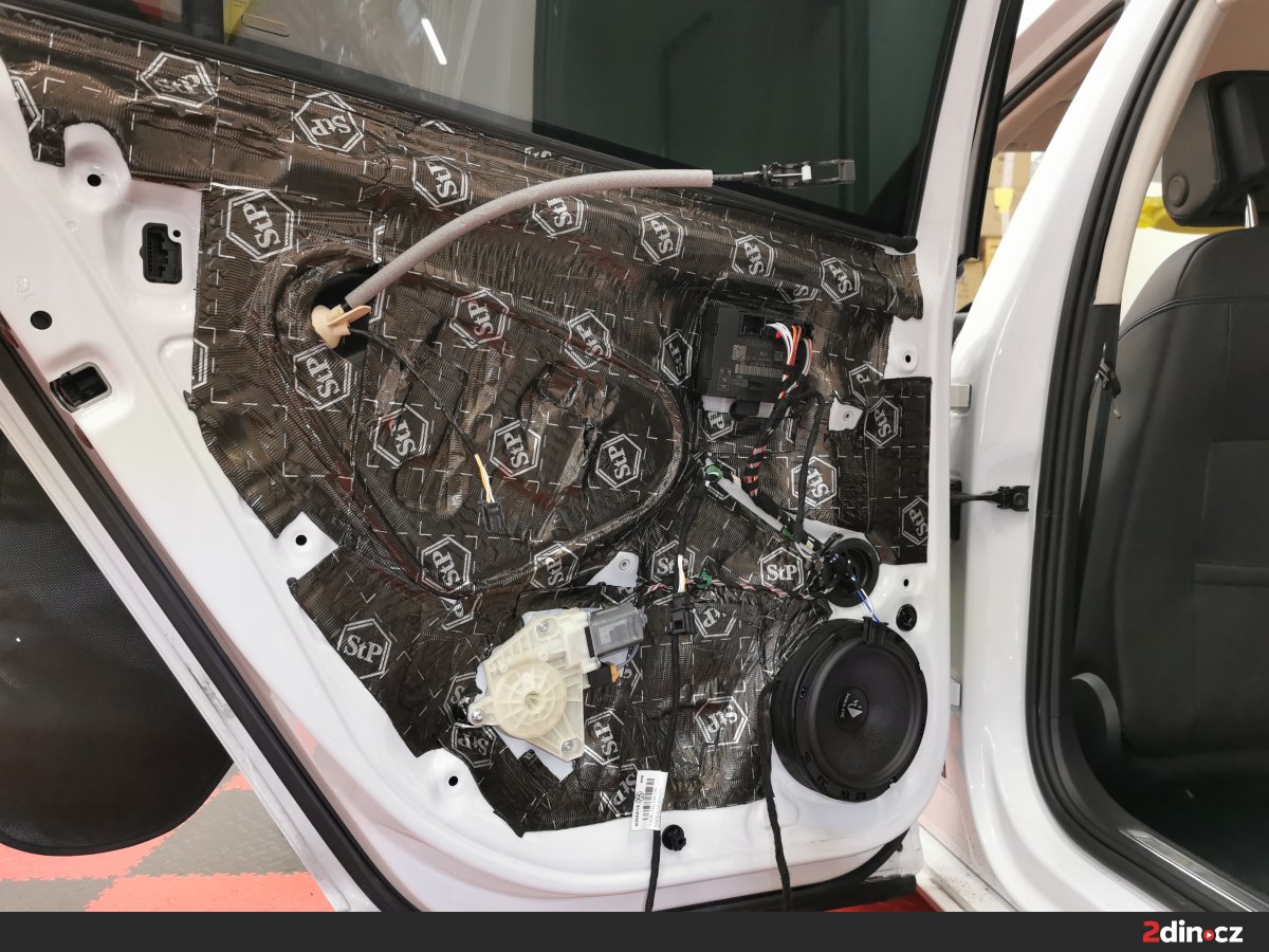 Ještě než jsme se pustili do montáže nových komponentů audio sestavy, odhlučnili jsme dveře a strop. Zejména u dveří je to důležité z toho důvodu, že správné ošetření z nich umožňuje vytvořit kvalitní ozvučnici, kde mají reproduktory lepší podmínky k tomu, aby naplno vynikly jejich kvality. V tomto případě jsme dveře i strop vozu ošetřili kombinací materiálů STP Black Gold Camo, STP Black Silver, CTK Multimat EVO, CTK Multimat PRO a STP Biplast 10, tedy antivibračních a protihlukových materiálů. Tento postup vedl k výraznému snížení hluku, eliminaci vibrací a lepší reprodukci středových frekvencí a výšek.