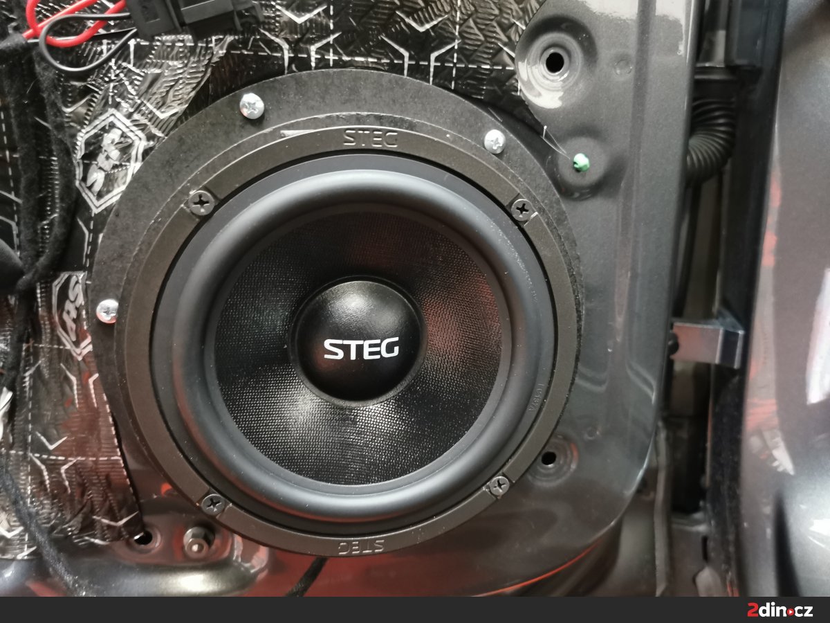 Do předních dveří jsme zvolili komponentní reproduktory STEG MT650C – oblíbenou volbu mezi náročnými posluchači. Tyto reproduktory vynikají silným a přesným středobasem, věrným podáním vokálů i živými výškami. Společně s odhlučněním dveří tak vytvořily zcela novou zvukovou scénu v přední části vozu. Jejich výkon se ale naplno projevil až po napojení na externí zesilovač s DSP, který zajišťuje detailní kontrolu nad každým pásmem.