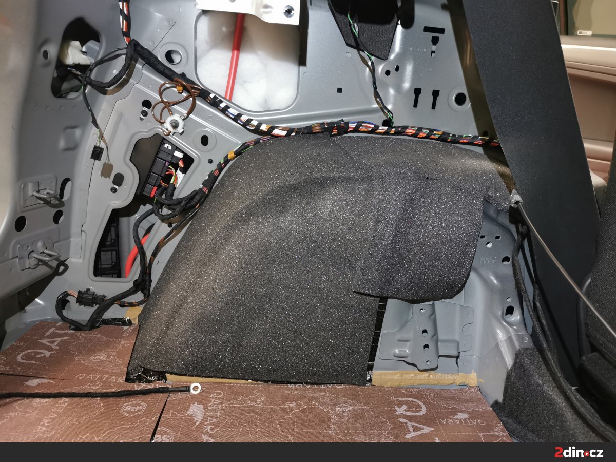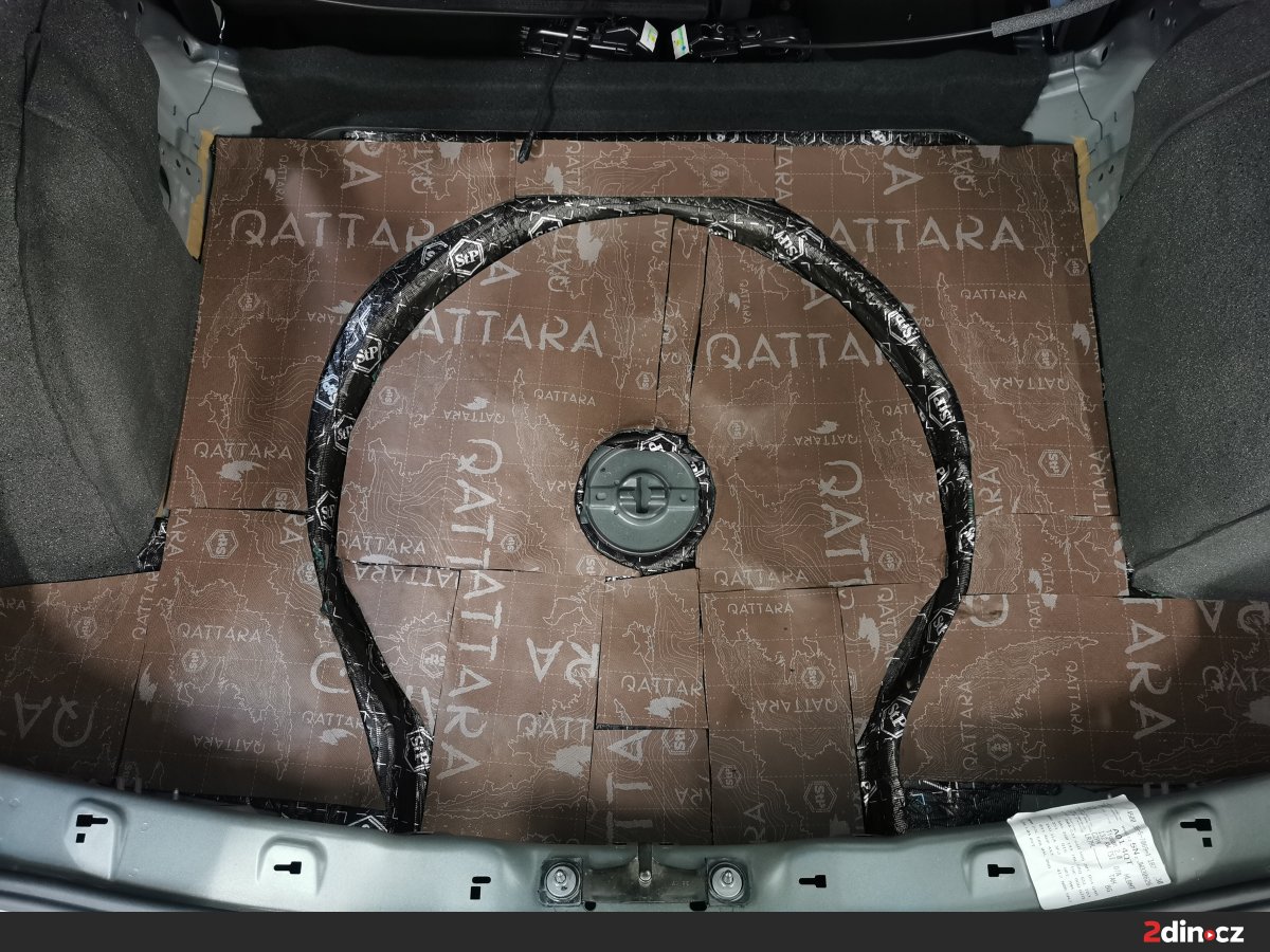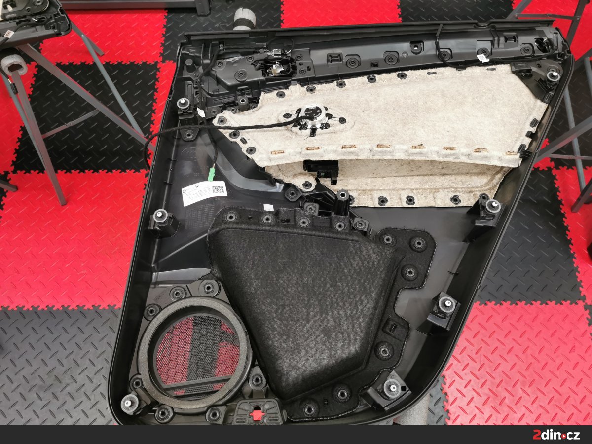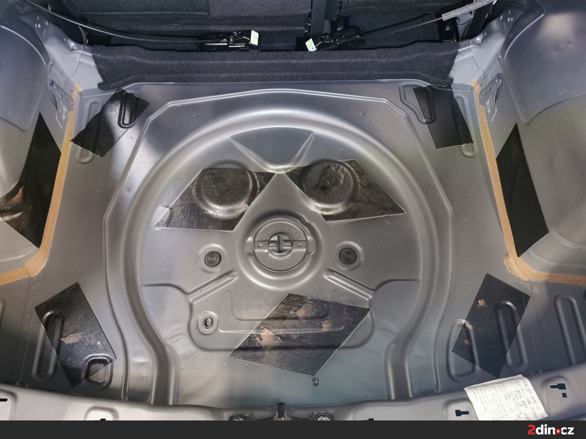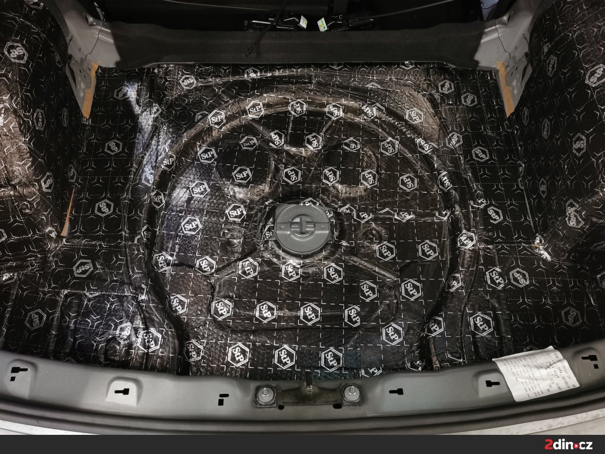 Ještě než jsme se pustili do montáže nových komponent, přistoupili jsme k odhlučnění dveří a zavazadlového prostoru. Použili jsme náš osvědčený vícestupňový systém s kombinací antivibračních (STP Black Silver) a protihlukových materiálů (STP Qattara, STP Sonora), které výrazně snižují vibrace karoserie i vnější hluk od podvozku a kol. Na plastové části dveří a čalounění jsme aplikovali akustickou pěnu STP Biplast 10, která pohlcuje zbytkové rezonance. Tento krok zásadně zlepšil akustické vlastnosti interiéru a umožnil připravit ideální podmínky pro nové reproduktory a subwoofer.