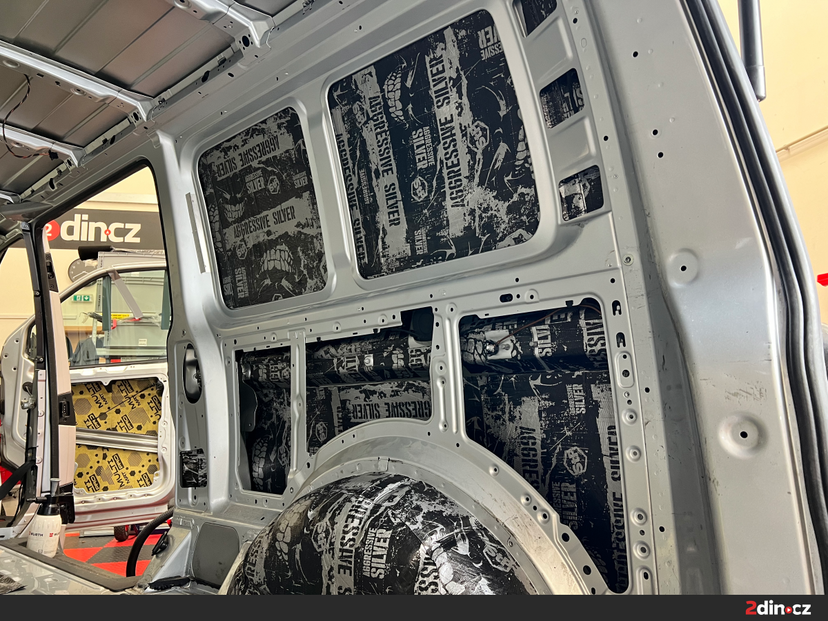 Strop je v dodávkách často podceňovaným, ale klíčovým rezonančním prvkem. Také zde se kvůli tenkému plechu a velké ploše se šíří vibrace a hluk napříč celým interiérem. V rámci montáže jsme nejprve sáhli po STP Aggressive Silver, který zamezil výrazným rezonancím. Následně byl aplikován STP AeroFlex 10, termoakustický materiál s vynikající schopností tlumit aerodynamický i okolní hluk. Kombinace těchto vrstev nám umožnila vytvořit pevný a účinný celek, který přispěl ke ztišení kabiny a lepším akustickým podmínkám pro audio sestavu.