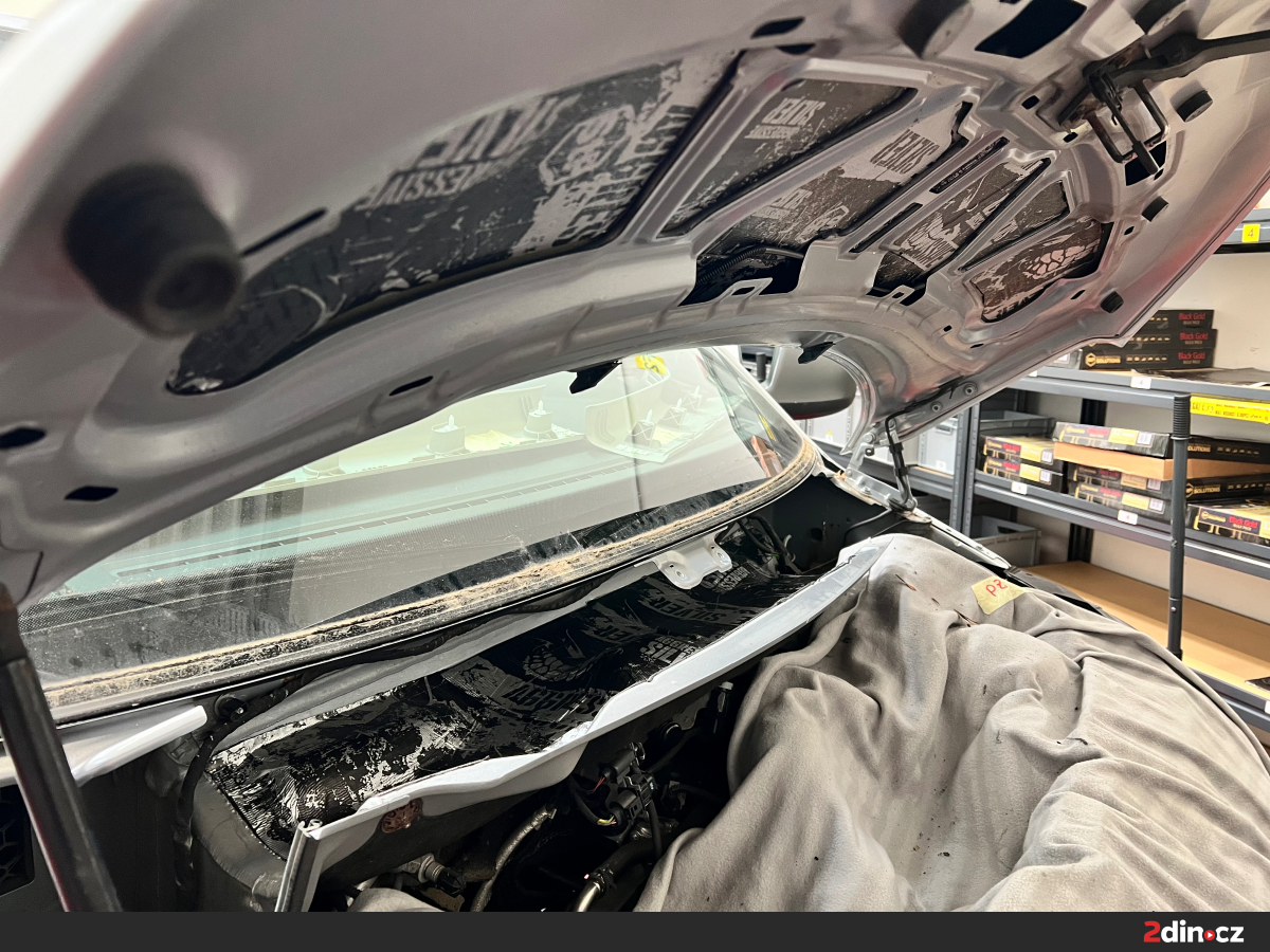 Hluk z motorového prostoru bývá v dodávkách velmi intenzivní, zvláště při zátěži. Řeší se odhlučněním kapoty a mezimotorové přepážky. Pro potlačení těchto zvuků byla nejprve aplikována antivibrační vrstva STP Aggressive Silver, která zpevnila tenké plechy a zabránila přenosu vibrací do kabiny. Na ni byla instalována dvojitá vrstva z materiálů Neoprene 3 a STP AeroFlex 10, které se vyznačují vysokou tepelnou odolností a schopností tlumit hluk. Tento krok výrazně ztišil hluk přicházející od spalovací jednotky a zároveň přispěl ke stabilizaci teploty uvnitř kabiny.